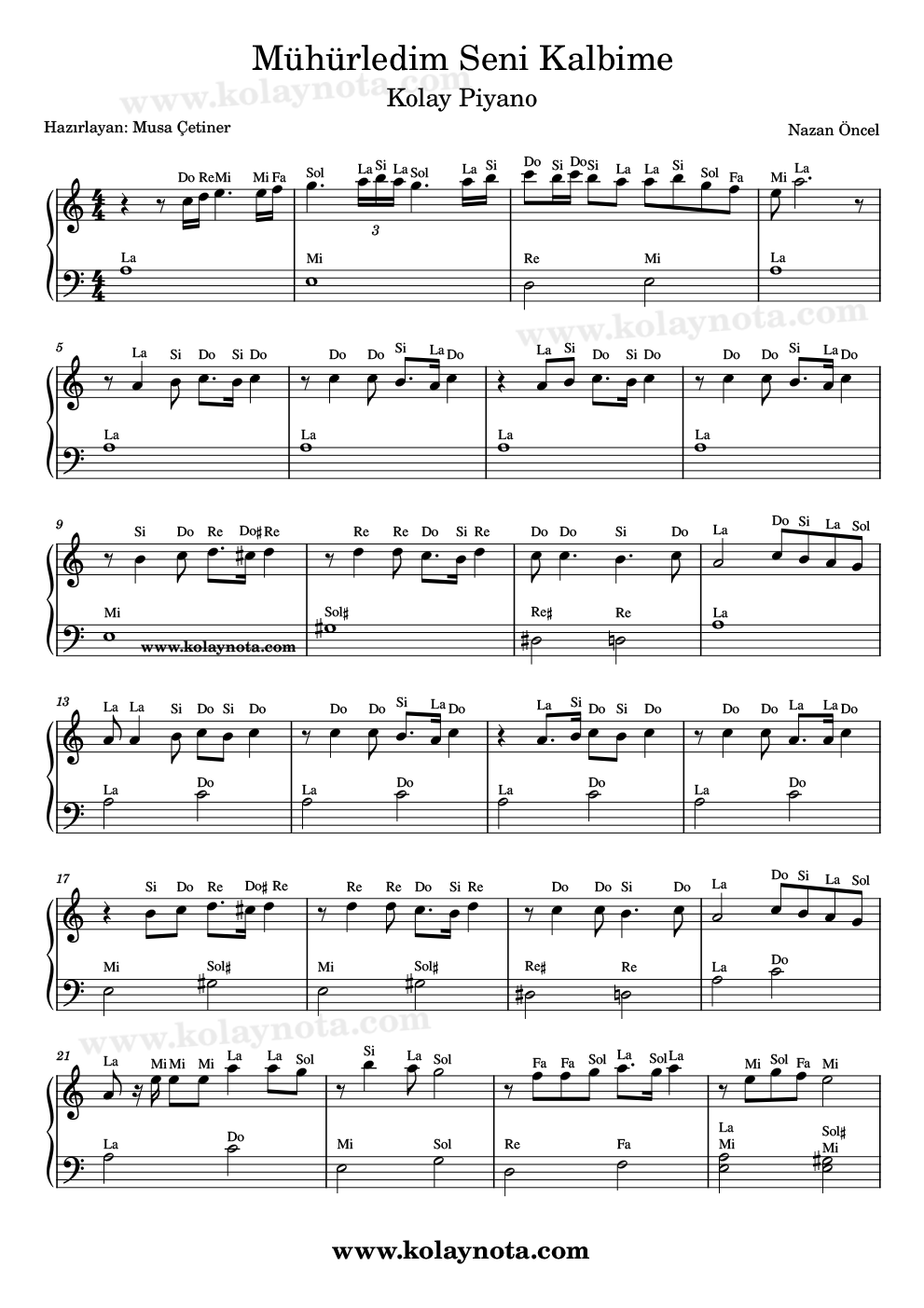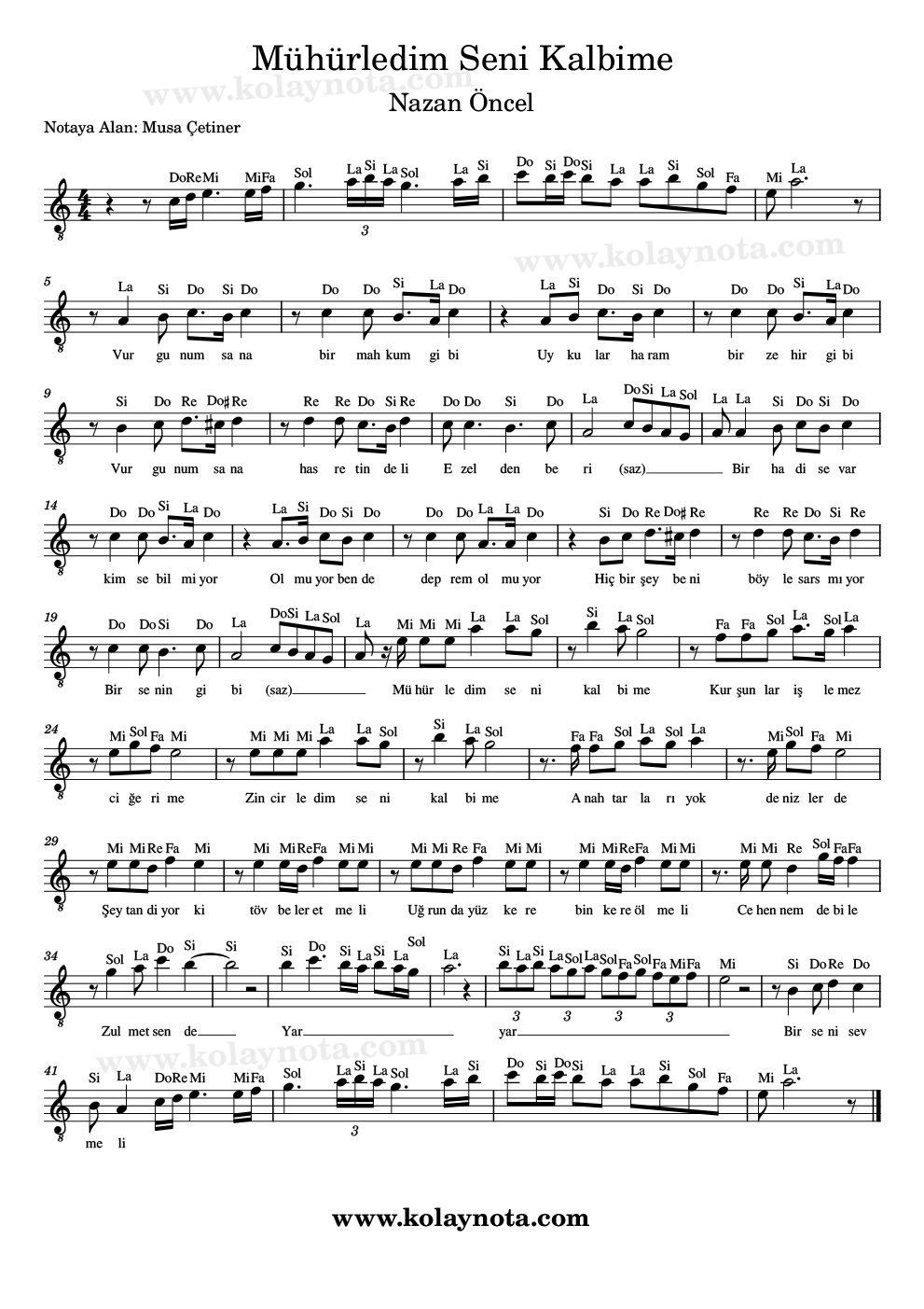 Mühürledim Seni Kalbime, Nota. Nazan Öncel’in 1991 yılında dinleyicilerle buluşan şarkısı. Yakın zamanda Mabel Matiz de seslendirmiş. La karar sesinde yorumlanmış, aynı karar seste notaya aldım. Kolay nota ve piyano düzenlemelerini görebilirsiniz bu yazıda. PDF ve imaj biçimlerinde görüntüleyebilir, keman, melodika, flüt, org gibi çalgılarda çalabilirsiniz.