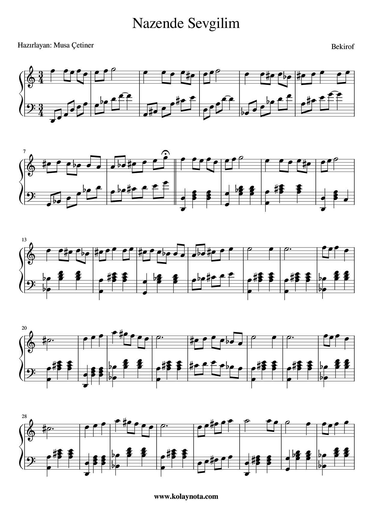 Nazende Sevgilim; bestecisi azeri sanatçı Bekirof olan, hicaz makamında bir şarkı. Piyano notalarını paylaşacağım bu yazıda. Piyano düzenlemesini la karar hazırladım. Buradaki düzenleme piyanoya yeni başlayan arkadaşlar için değil, şimdiden uyarayım. Kolay Piyano düzenlemesine buradan ulaşabilirsiniz. Başarılar.