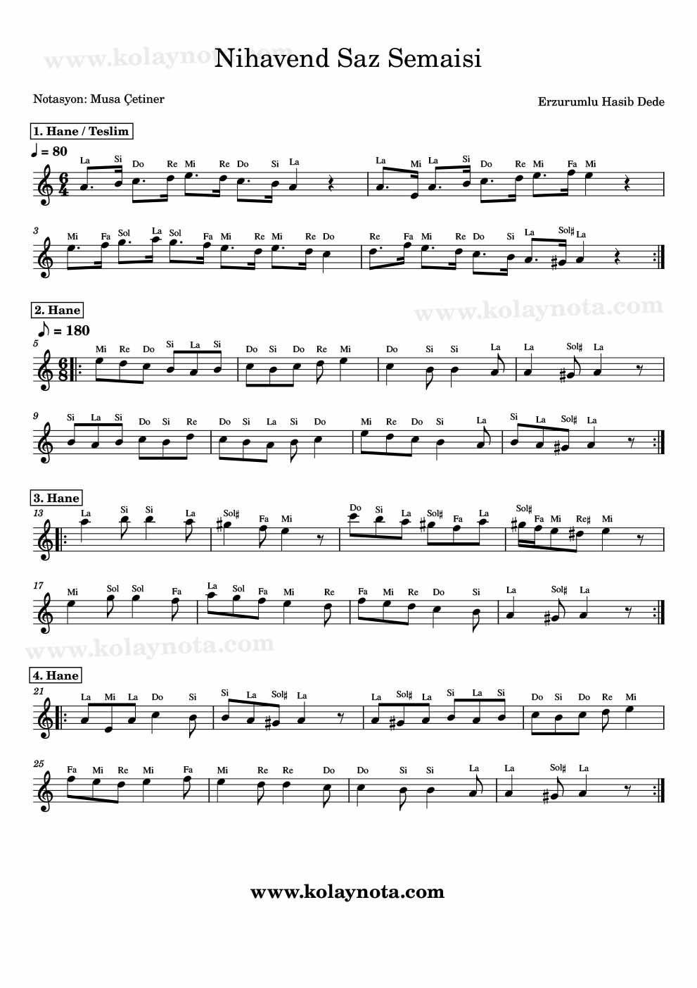 Nihavend Saz Semaisi, Nota. Erzurumlu Hasib Dede’nin bir eseri. Adından da anlaşılacağı üzere Nihavend makamında. La karar sesinde notasını hazırladım. Notasyonda haneler ve teslim bölümünü göreceksiniz. Her haneden sonra teslim bölümü olan olan 1. haneyi çalmanız gerekli. Kolay notasını görebilirsiniz bu yazıda. Keman, ud, ney, flüt, melodika, org gibi çalgılarda çalabilirsiniz. Notasyonu dinleyebilirsiniz.