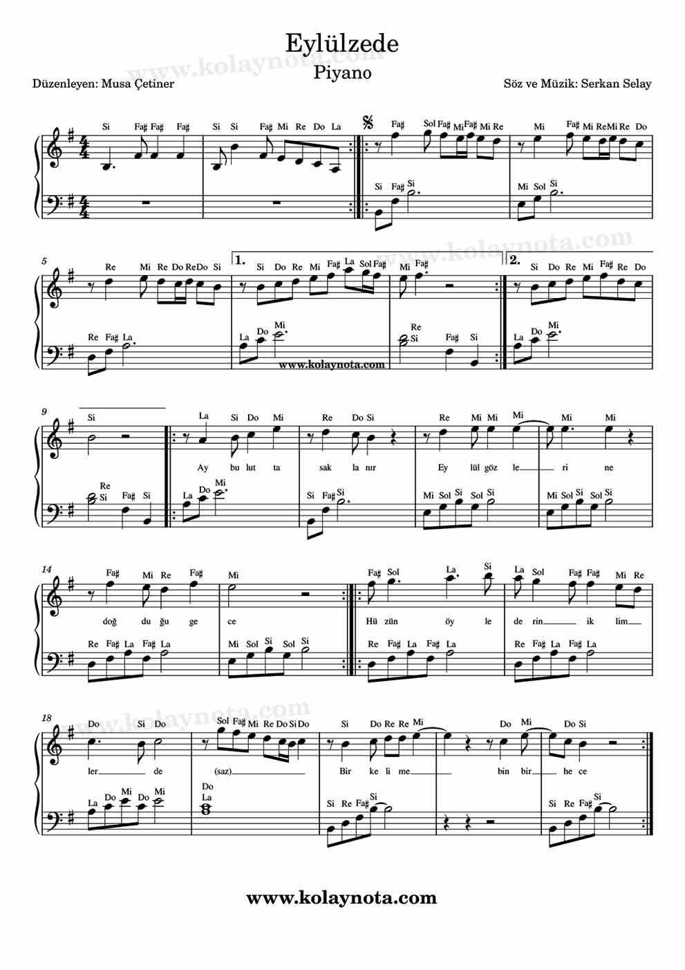 Eylülzede, Nota. Nikbinler grubu tarafından da yorumlanan bir şarkı. Sözü ve müziği Serkan Selay’a ait. Uşak makamında bestelenmiş. Si karar sesinde okunmuş, ben La karar sesinde notaya aldım. Keman, piyano, melodika, flüt, org gibi çalgılarda çalabilir, PDF ve Jpg biçiminde görüntüleyebilirsiniz. Notayı dinleyerek doğru bir şekilde çalışabilirsiniz.