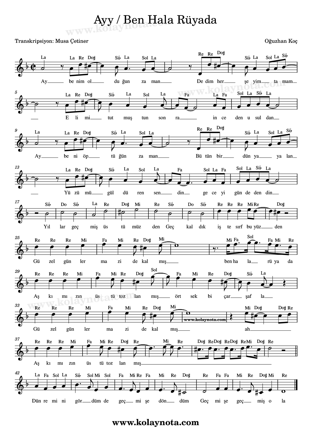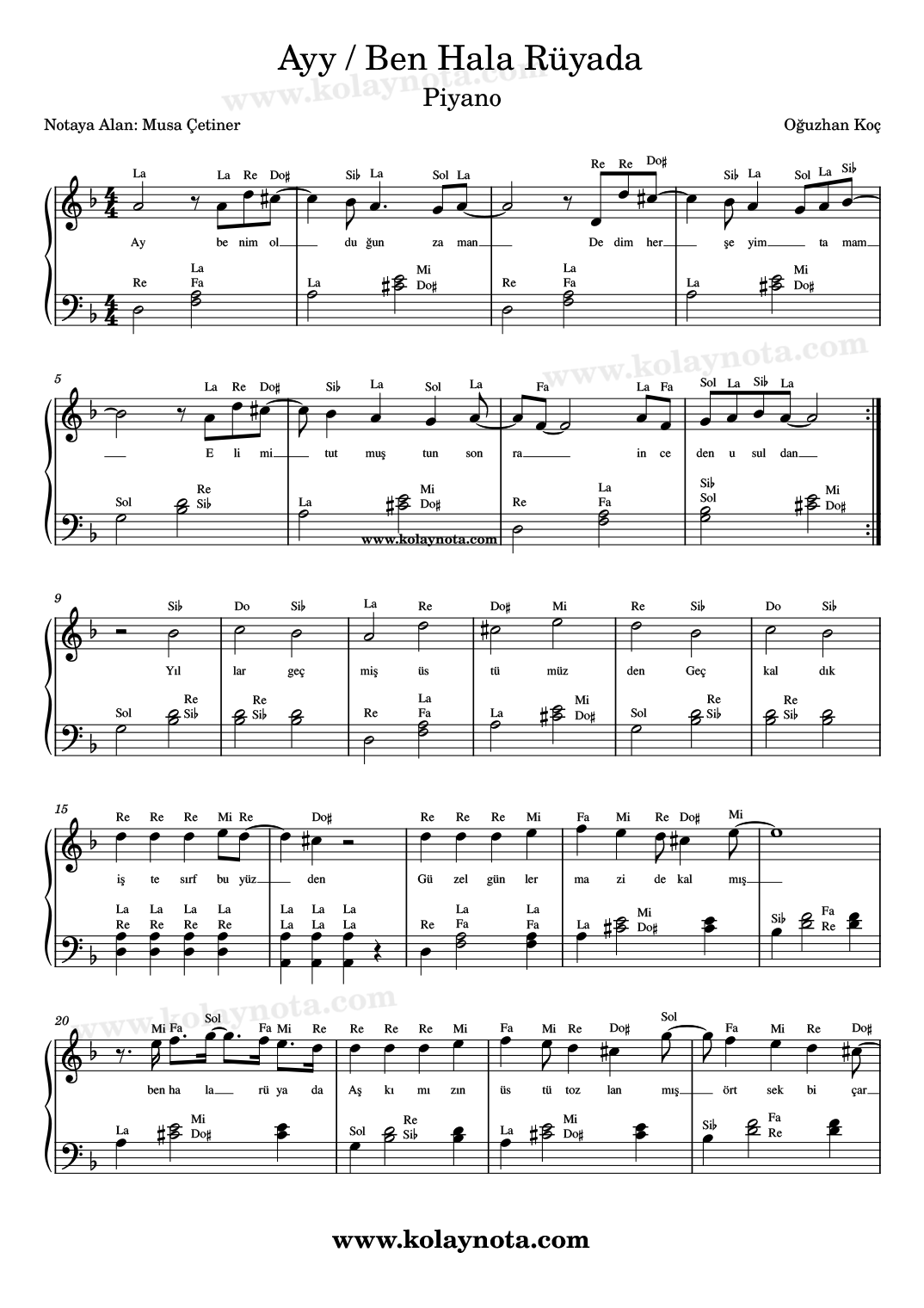 Ayy / Ben Hala Rüyada, Nota. Oğuzhan Koç’un bir şarkısı. Sanatçının 2013 yılında çıkan aynı adlı albümünde yer almış. Nihavend makamında bir şarkı. Re karar sesinde yorumlanmış, aynı karar seste notaya aldım. Kolay nota ve piyano düzenlemesini görebilirsiniz. Keman, melodika, flüt, org gibi çalgılarda çalabilir, PDF ve imaj biçiminde görüntüleyebilirsiniz.