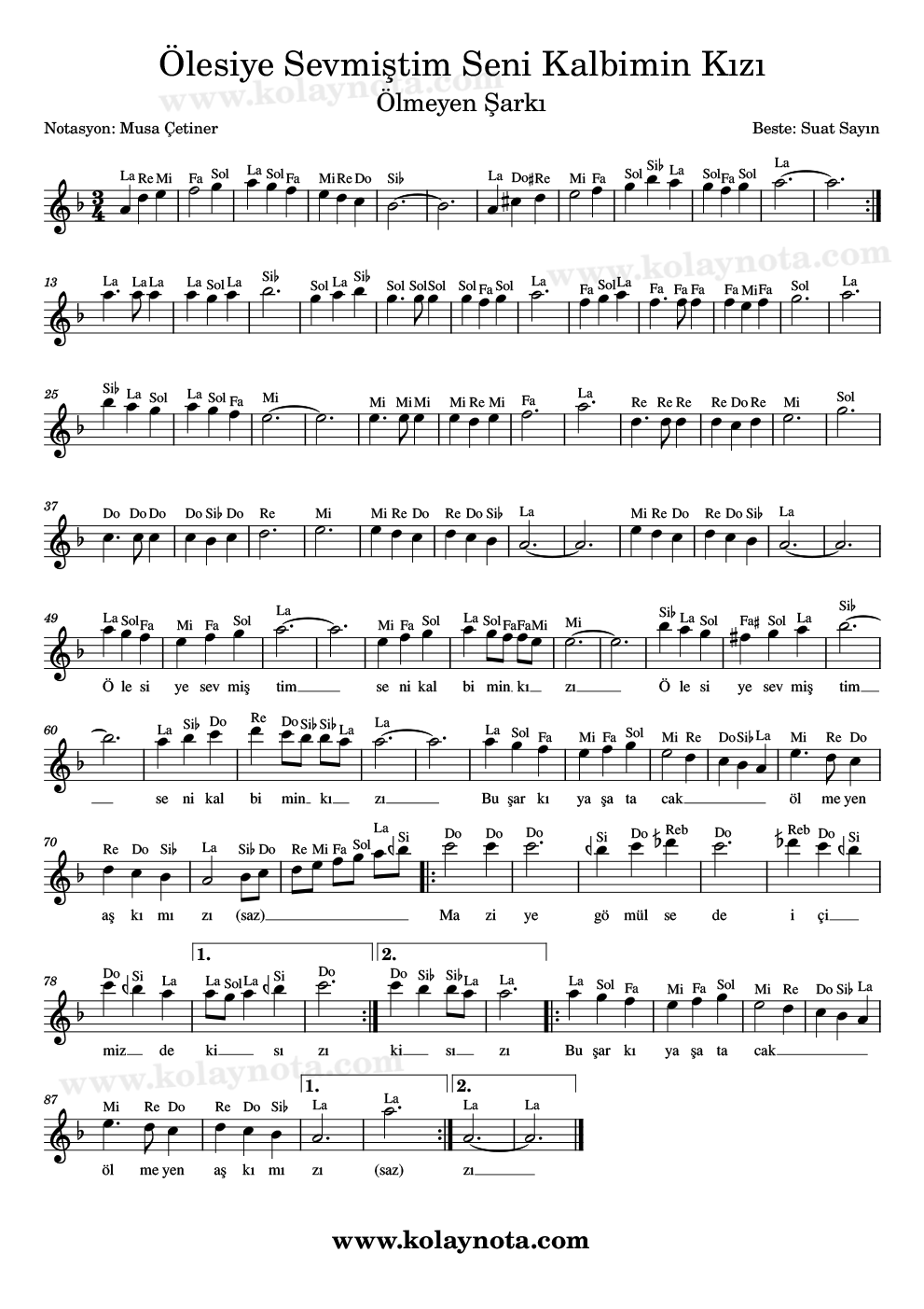 Ölesiye Sevmiştim Seni Kalbimin Kızı, Nota. Ölmeyen Şarkı adı ile de bilinen bir şarkı. Bestesi Suat Sayın’a ait. Kürdi makamında bir eser, La Karar sesinde notaya aldım. Keman, melodika, flüt, piyano, org, ud gibi çalgılarda çalabilir, PDF ve imaj biçiminde görüntüleyebilirsiniz.