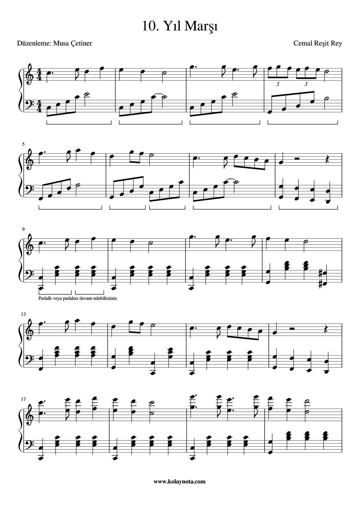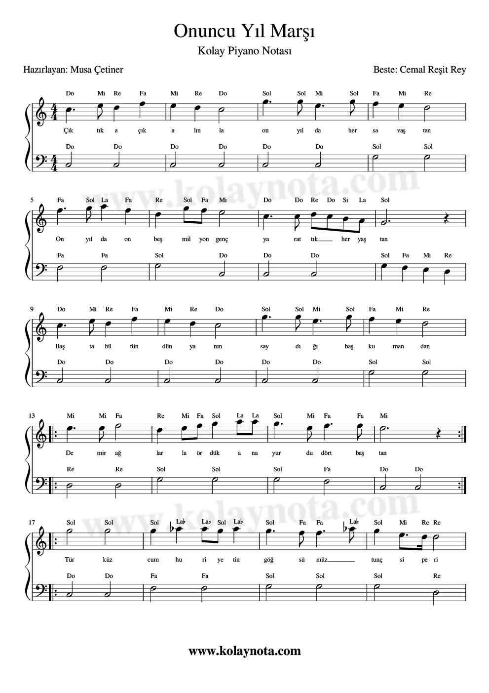 Onuncu Yıl Marşı bestesi Cemal Reşit Rey, sözleri Faruk Nafiz Çamlıbel ve Behçet Kemal Çağlar‘a ait olan bir eser. Piyano ve Kolay Piyano düzenlemesini paylaşacağım bu yazıda. Notaları Pdf ve Jpg formatında görebilirsiniz. Video linklerini de başlıkların altına ekleyeceğim.