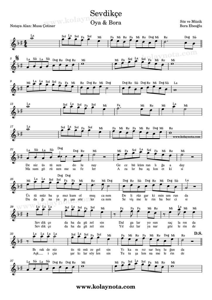Sevdikçe, Nota. 90’ların sevilen grubun Oya ve Bora’nın bir şarkısı. Karar sesine bakarsak Nihavend makamında bir şarkı. Re Karar sesinde notaya aldım. Notasyonu dinleyebilir, PDF ve imaj biçiminde görüntüleyebilir, keman, melodika, flüt, org, piyano gibi çalgılarda çalabilirsiniz.