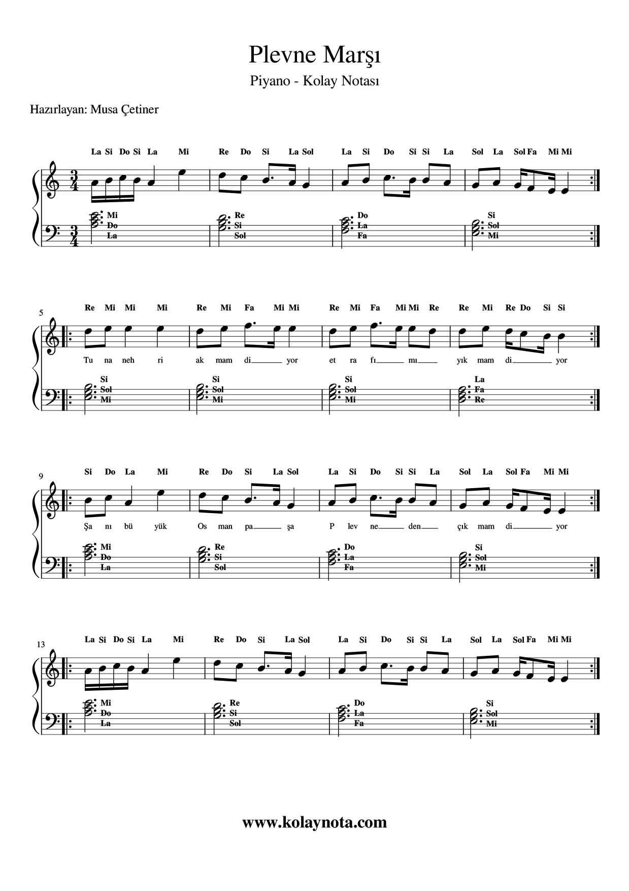 Plevne Marşı yada diğer bilinen adıyla “Tuna Nehri Akmam Diyor” çok bilinen bir melodi. Kolay piyano biçiminde düzenledim. Piyano çalmaya yeni başladıysanız ve şarkıyı seviyorsanız bu düzenlemeyi çalmayı deneyebilirsiniz.