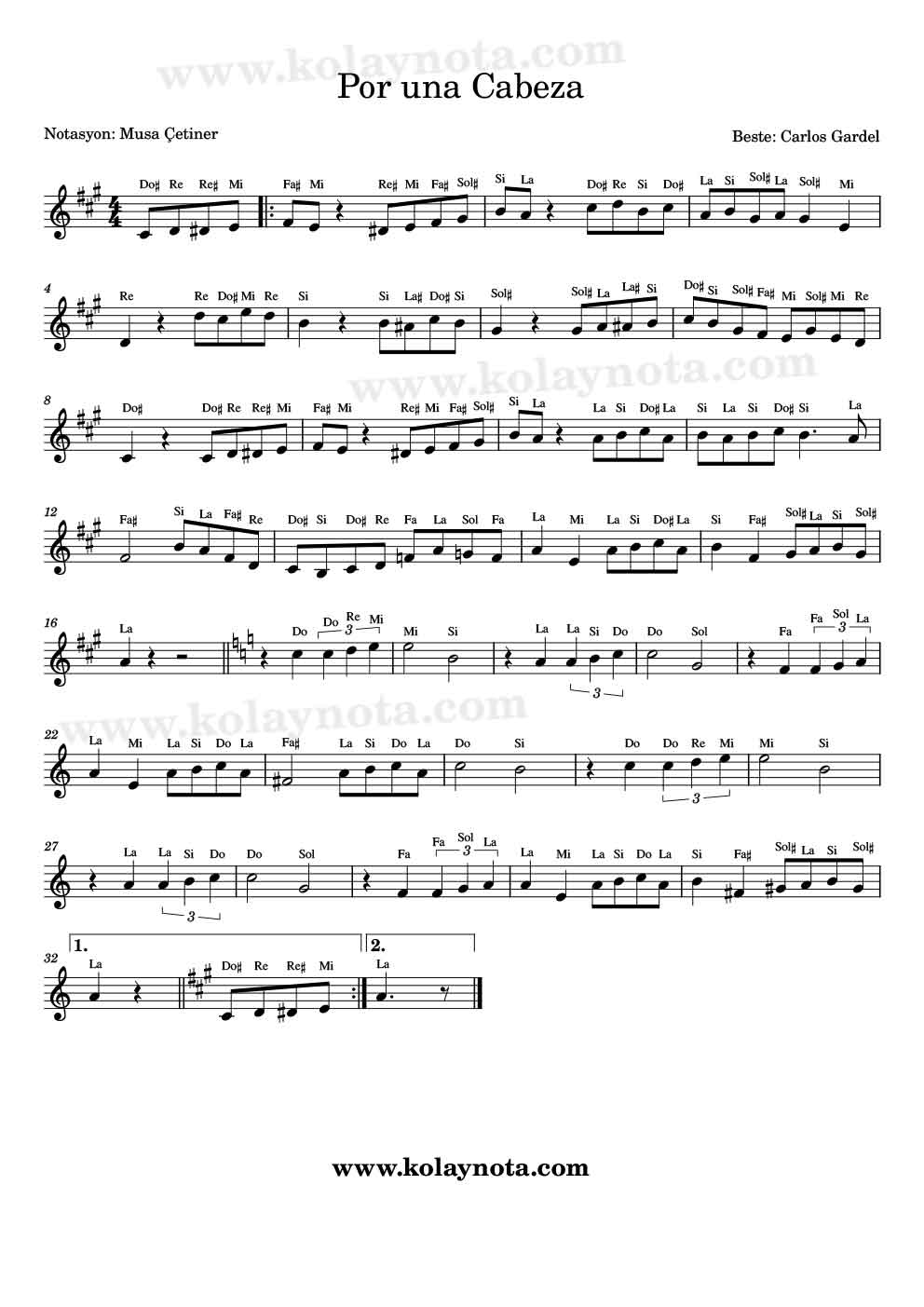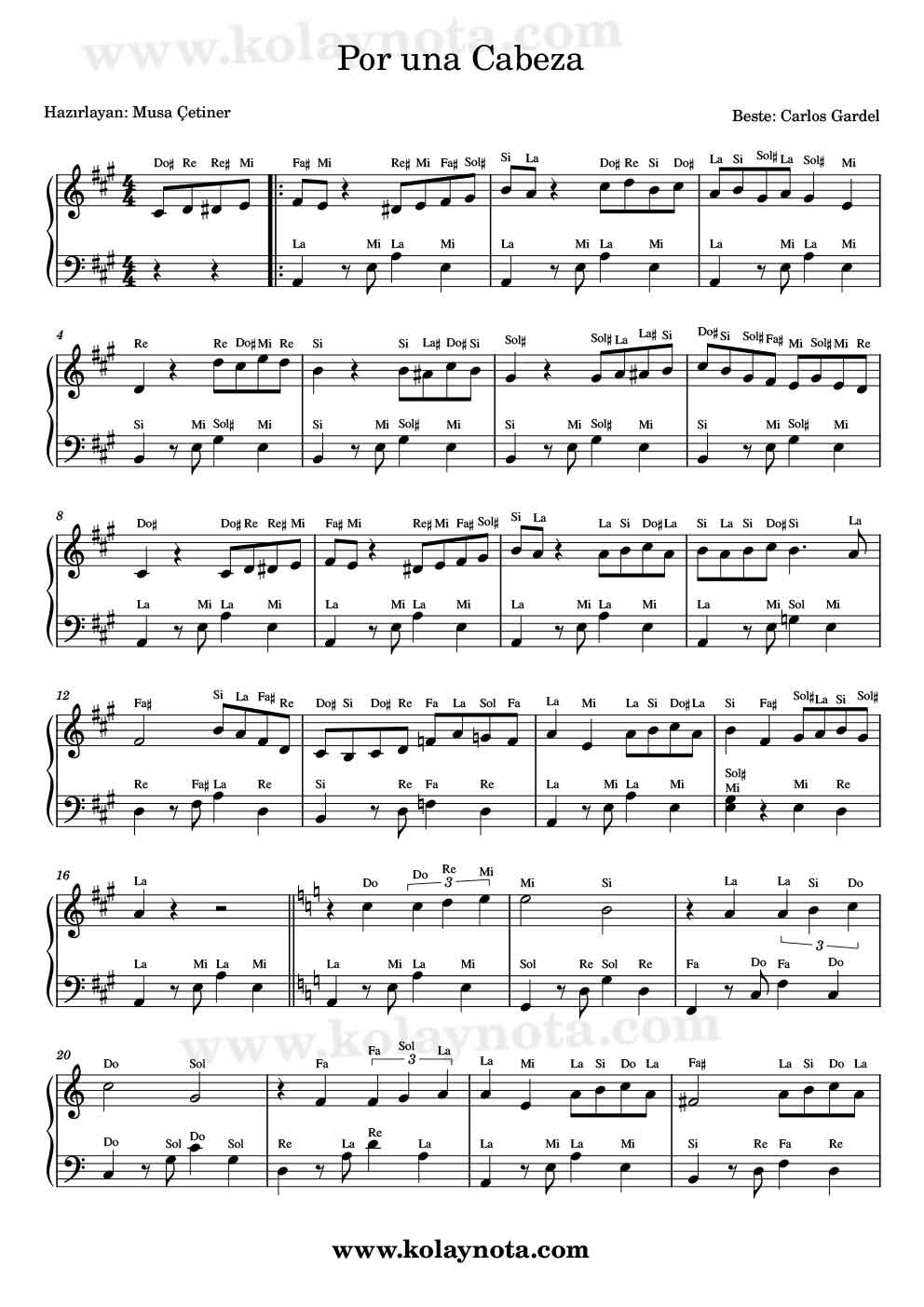 Keman, melodika, flüt, org notası. Bestesi Carlos Gardel, sözleri Alfredo Le Pera’ya ait olan bir şarkı. Tango türünde bir eser, majör ve minör olarak 2 bölümden oluşuyor. La Majör tonunda Kolay notası ve piyano notasını hazırladım. Kolay notasına sözlerini yazmadım, belki ileride eklerim.