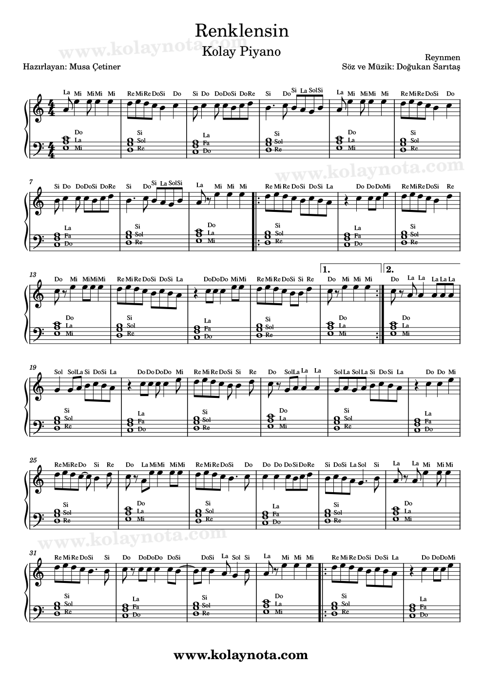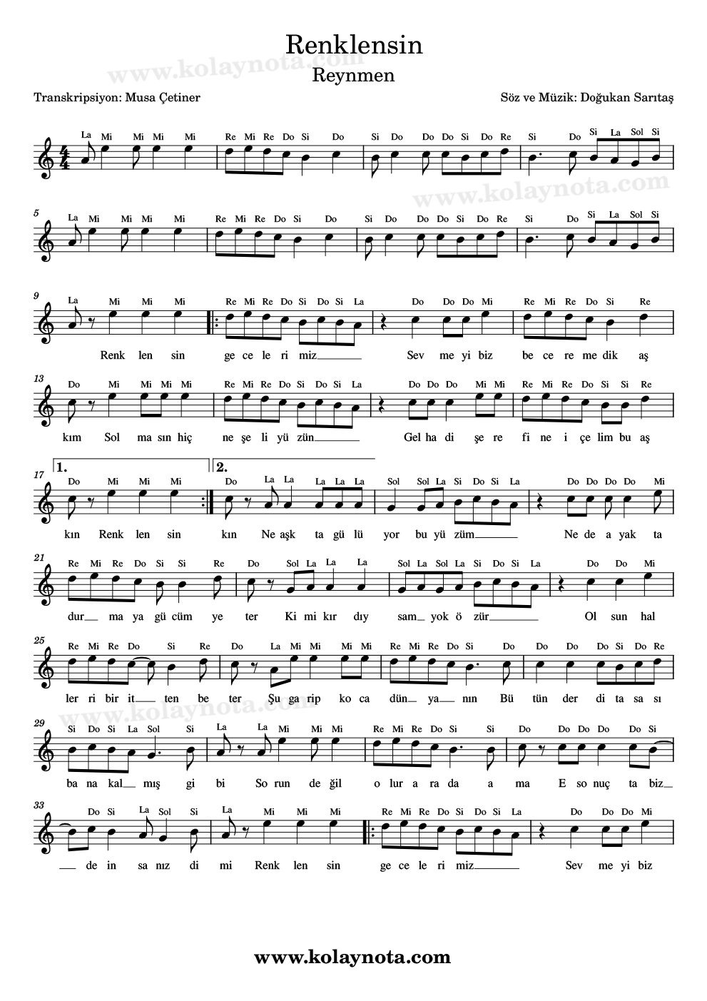 Renklensin, Nota. Sözü ve bestesi Doğukan Sarıtaş’a ait, Reynmen’in seslendirdiği bir şarkı. Nihavend makamında, La Karar sesinde yorumlanmış, aynı karar seste notaya aldım. Kolay Nota ve piyano düzenlemesini görebilirsiniz bu yazıda. Keman, piyano, melodika, flüt, org gibi çalgılarda doğru bir şekilde çalabilirsiniz. Notasyonu PDF ve İmaj biçimlerinde görebilirsiniz.