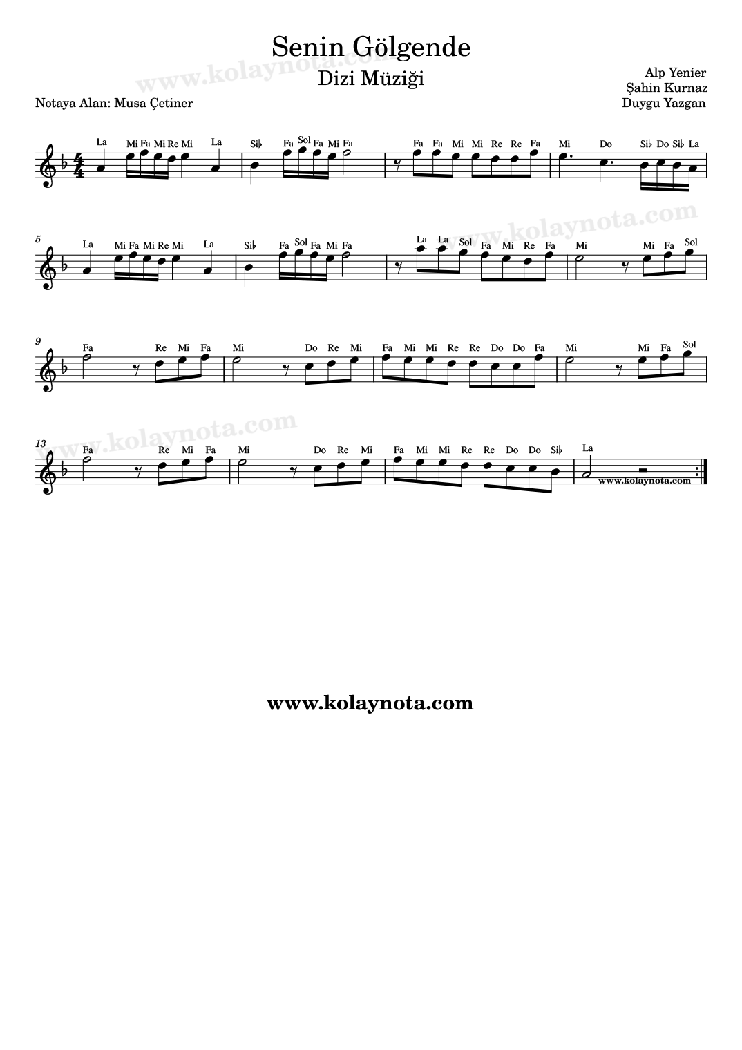 Senin Gölgende, Nota. Sahipsizler dizisinin müziklerinden. Bestesi Alp Yenier, Şahin Kurnaz ve Duygu Yazgan’a ait. Kürdi dizisi üzerine bestelenmiş, La karar sesinde çalınmış, aynı karar seste notaya aldım. Keman, piyano, melodika, flüt, org gibi çalgılarda çalabilir, PDF ve imaj biçiminde görüntüleyebilirsiniz.