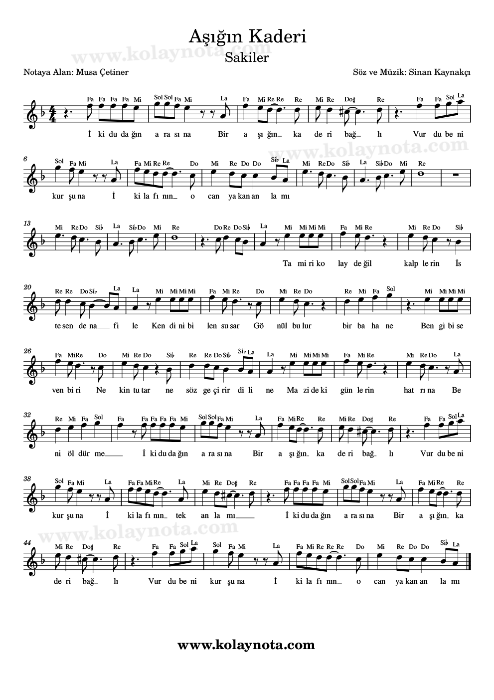 Aşığın Kaderi, Nota. Sakiler grubunun seslendirdiği bir şarkı. Sözü ve müziği Sinan Kaynakçı’ya ait. Kürdi makamında bestelenmiş, Fa# karar sesinde okunmuş, ben La karar sesinde notaya aldım. PDF ve imaj biçimlerinde görebilir, keman, melodika, flüt, org, piyano gibi çalgılarda çalmayı deneyebilirsiniz.