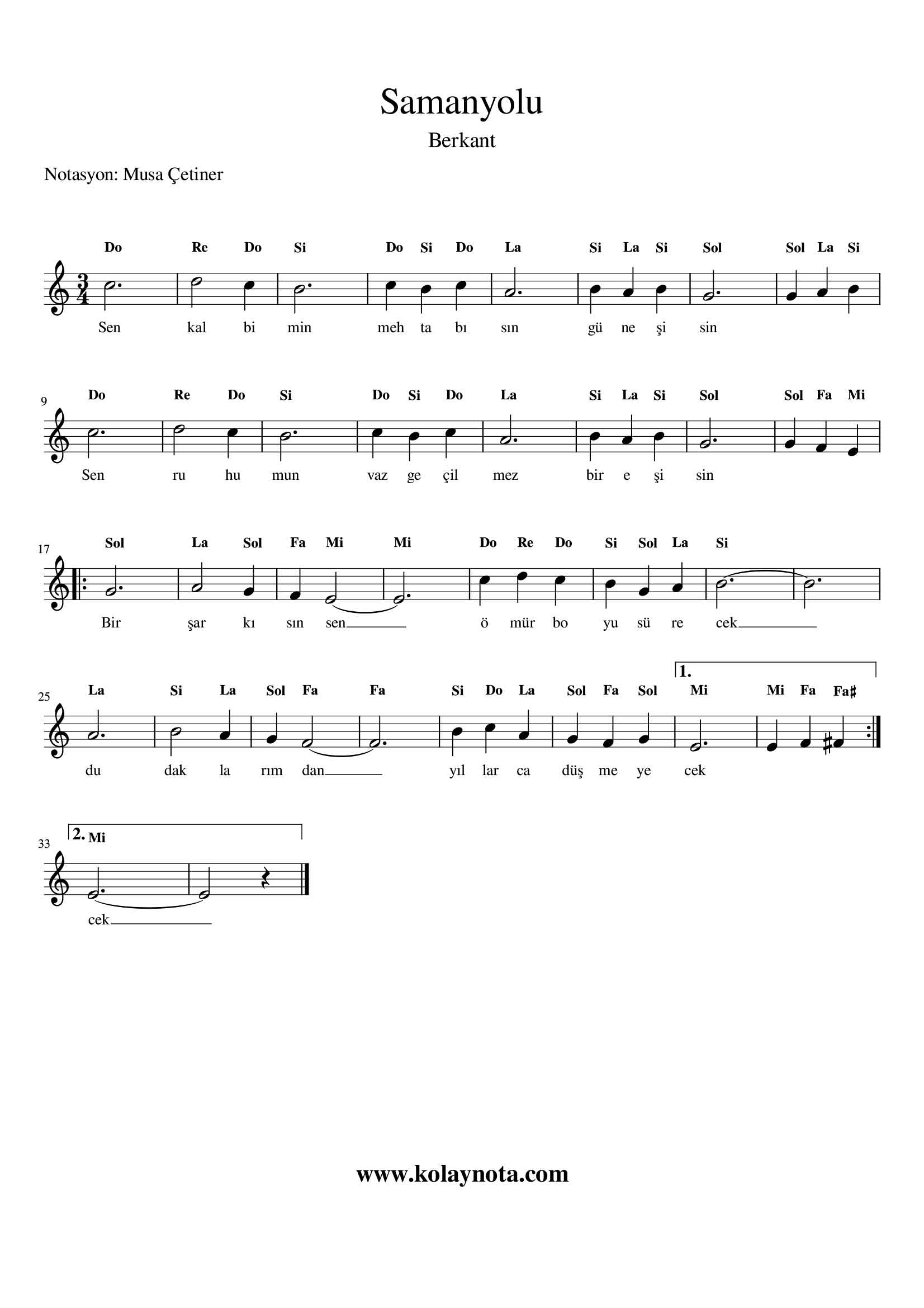 Samanyolu; Berkant’ın sevilen ve çok bilinen bir şarkısı. Eserin bestesi Teoman Alpay, sözleri ise Aysel Gürel’e ait. Kolay notasını göreceksiniz bu yazıda. Do Re Mi notaları için buraya tıklayın. Notasyonu da dinleyerek şarkıyı doğru bir biçimde çalabilirsiniz. Başarılar.