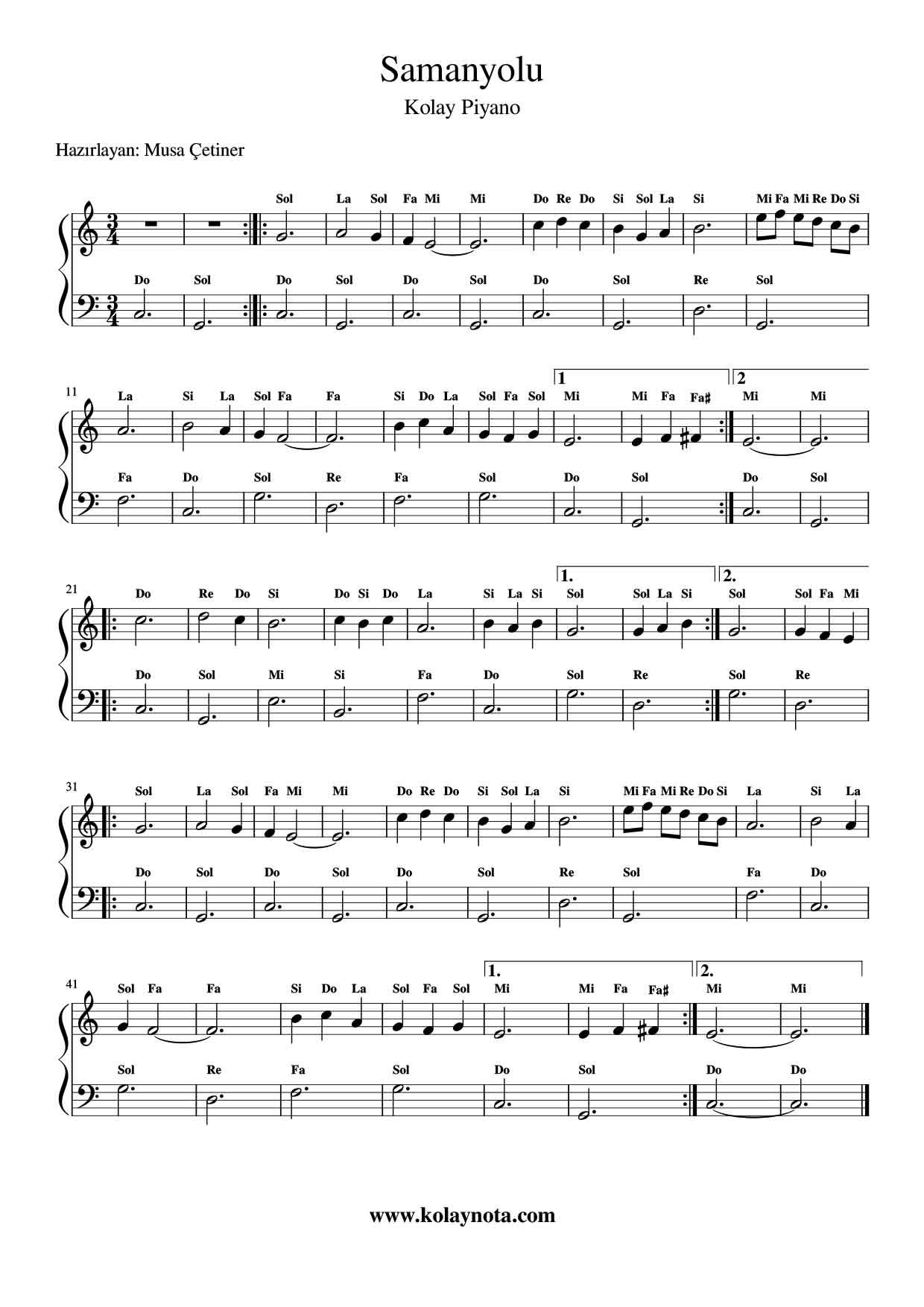 Samanyolu; Berkant’ın yorumuyla hafızalara yerleşen bir Teoman Alpay bestesi. Kolay piyano düzenlemesini göreceksiniz bu yazıda. Sol elde zorlanmadan çalabileceğiniz tek sesli bir eşlik var. Şarkının piyano notalarını pdf ve jpg biçiminde görebilirsiniz. Çalınış videosunu da ekleyeceğim, izleyip doğru bir biçimde çalabilirsiniz. Başarılar.
