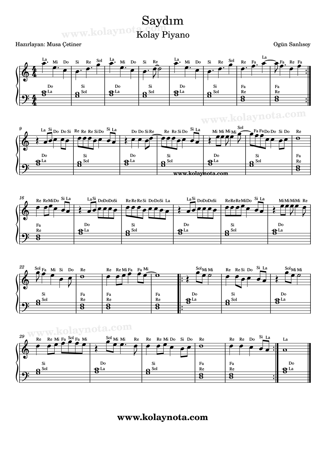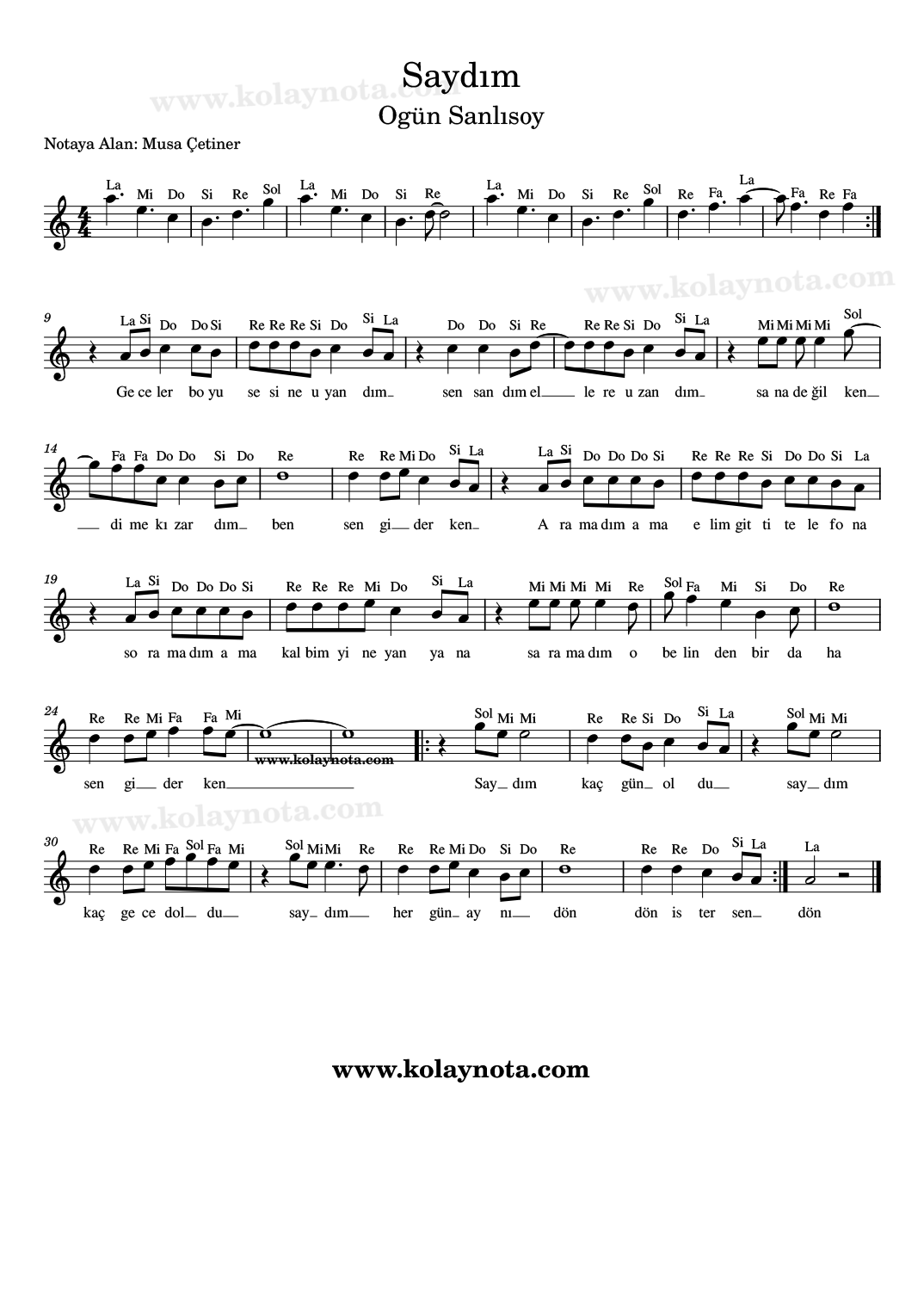 Saydım, Nota. Ogün Sanlısoy’un çok sevilen bir şarkısı. Sanatçının 2004 yılında çıkan “O Gün” adlı albümünde yer almış. Fa# minör tonunda bir şarkı, Ben La minör tonunda notaya aldım. Do Re Mi, Kolay nota ve piyano düzenlemesini görebilirsiniz bu yazıda. Keman, piyano, melodika, flüt, org gibi çalgılarda çalabilir, PDF ve imaj biçimlerinde görüntüleyebilirsiniz.