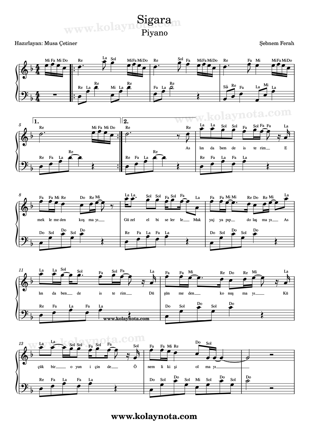 Sigara, Nota. Şebnem Ferah’ın bir şarkısı. 2001 yılında çıkan “Perdeler” albümünde yer aldı. Sonrasında Müslüm Gürses’de şarkıyı 2010 yılında çıkan ” Yalan Dünya” albümünde seslendirdi. La minör tonunda notaya aldım.