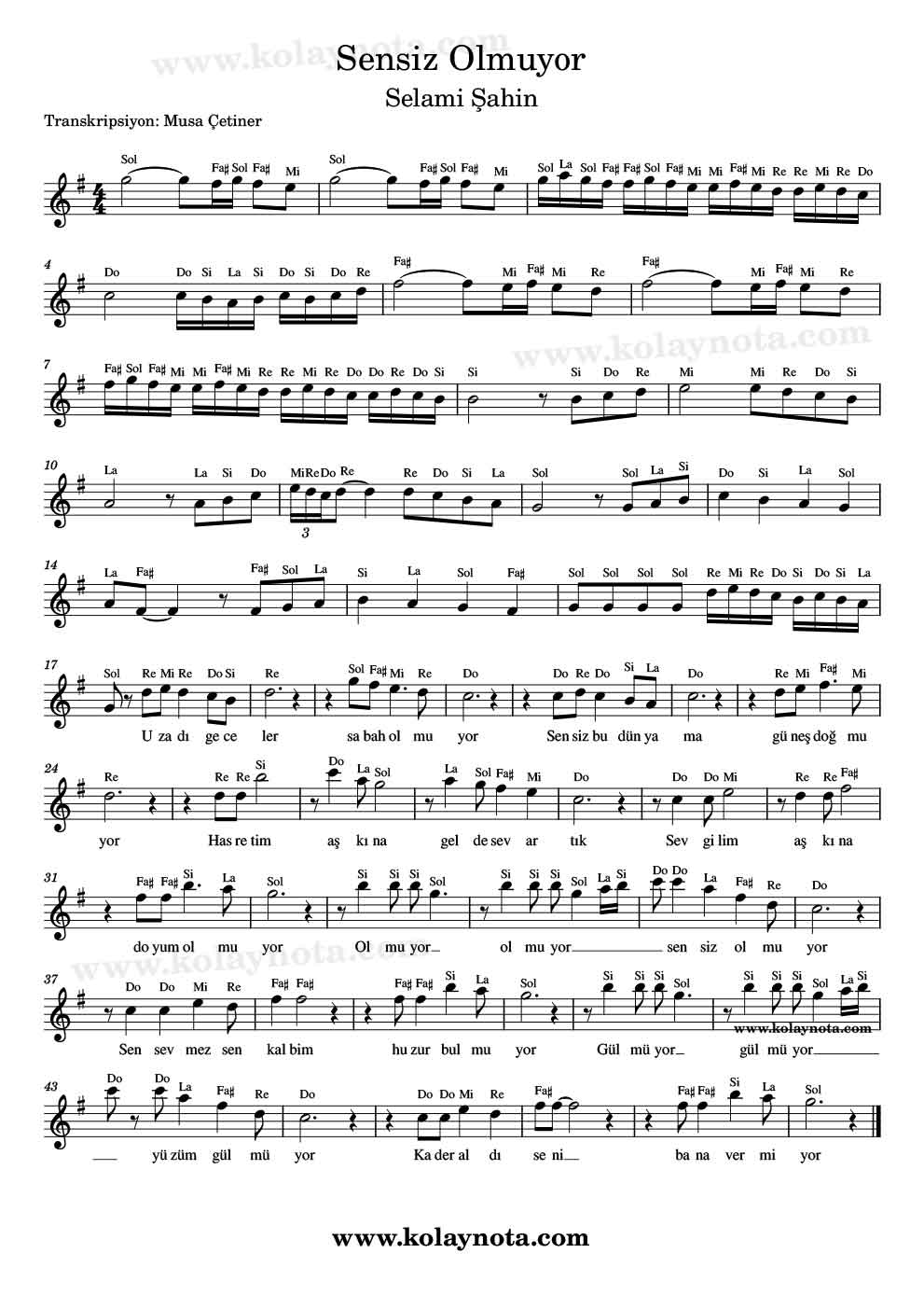 Sensiz Olmuyor çok bilinen bir Selami Şahin şarkısı. Mahur makamında bestelenmiş, Sol karar sesinde notaya aldım. Do Re Mi ve Kolay notasını hazırladım. Do Re Mi nota sadece sözlü bölümleri içeriyor. Notasyonu dinleyerek doğru bir şekilde çalışabilirsiniz