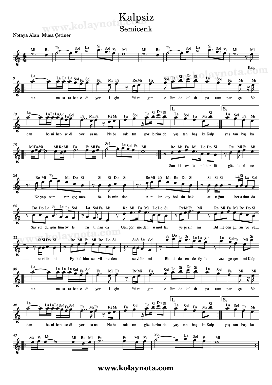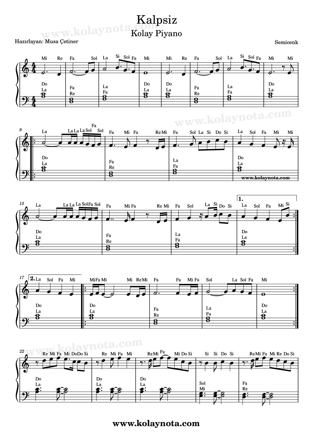 Kalpsiz – Kolay Nota