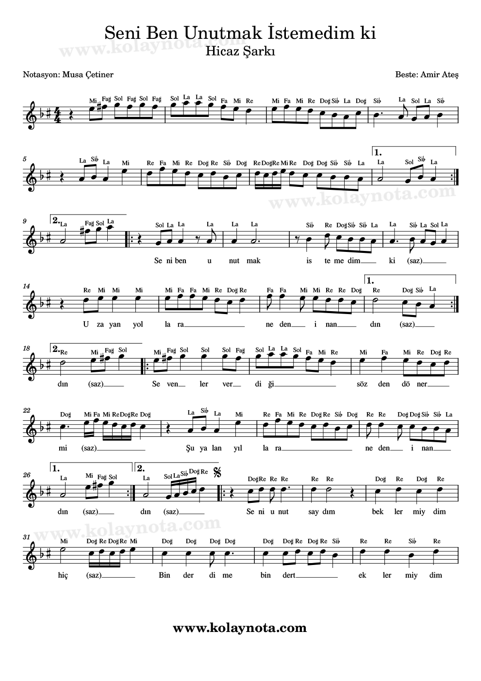 Seni Ben Unutmak İstemedim ki, Nota. Bestesi Amir Ateş’e ait olan, Hicaz makamında bir şarkı. La Karar sesinde notaya aldım, Sib ve Do# notalarına dikkat etmelisiniz. Keman, melodika, flüt, ud, ney, bağlama, org gibi çalgılarda çalabilirsiniz. Notasyonu PDF ve imaj biçimlerinde görebilirsiniz.