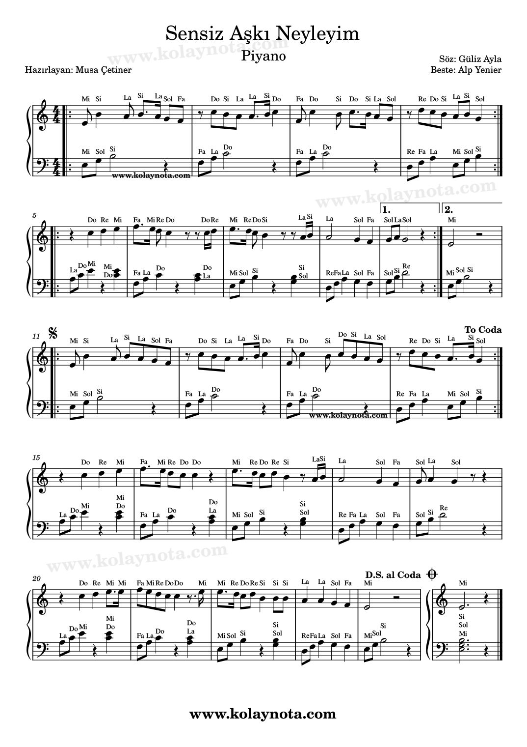 Sensiz Aşkı Neyleyim, Nota. Güliz Ayla’nın bir şarkısı. Bestesi Alp Yenier, sözleri Güliz Ayla’ya ait. Bir Gece Masalı dizisinin müziklerinden. Kürdi makamında bir şarkı, mi karar sesinde notaya aldım. Kolay nota ve piyano düzenlemesini görebilirsiniz bu yazıda. Keman, melodika, flüt, org gibi çalgılarda çalabilir, PDF ve imaj biçimlerinde görüntüleyebilirsiniz.