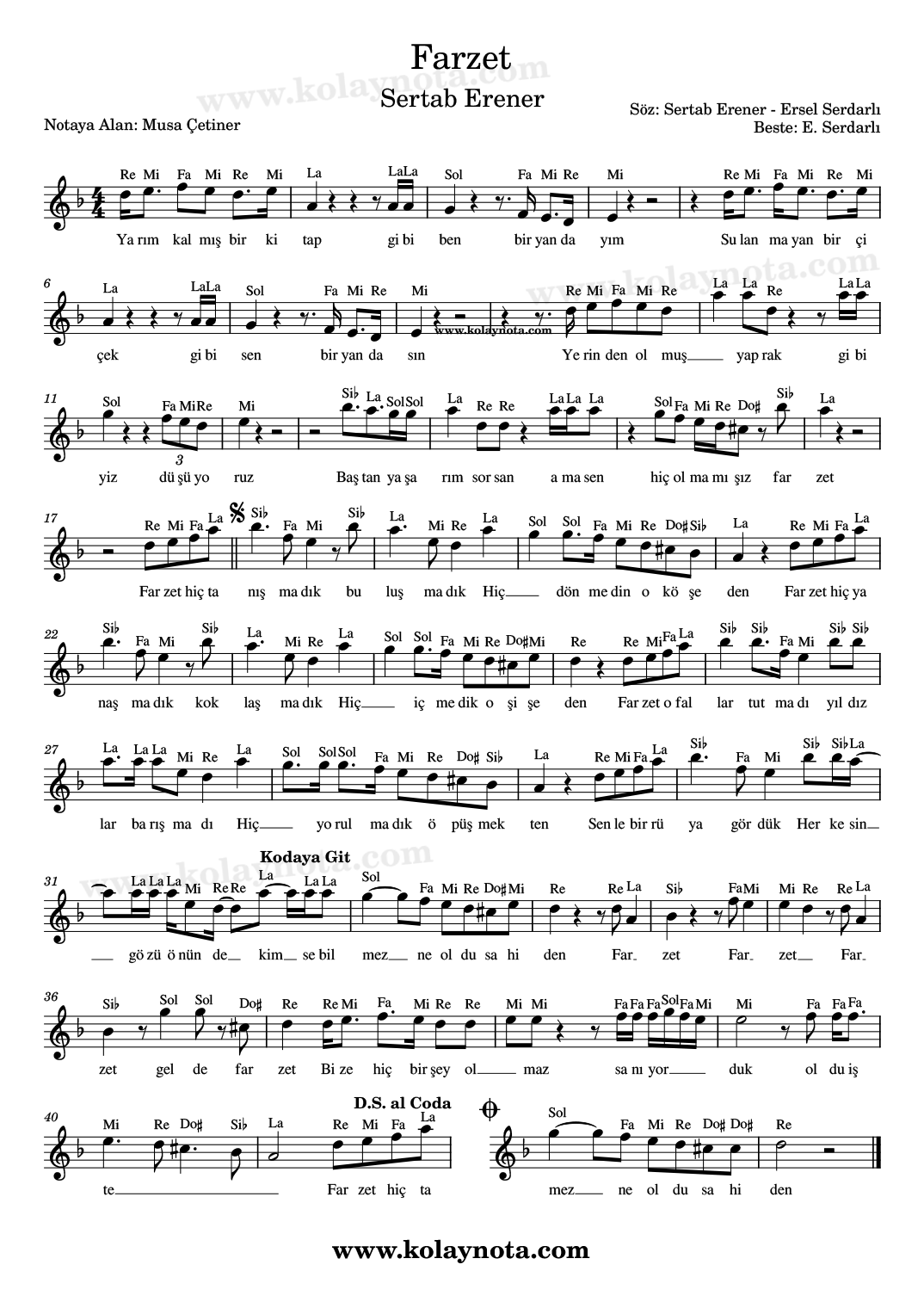 Farzet, Nota. Sertab Erener’in bir şarkısı. Bestesi Ersel Serdarlı, sözleri Serdarlı ve Erener’e ait. Re minör tonunda yorumlanmış, aynı tonda notaya aldım. Kolay Nota ve piyano düzenlemesini görebilirsiniz. Keman, melodika, flüt, org gibi çalgılarda çalabilir, PDF ve imaj biçiminde görüntüleyebilirsiniz.