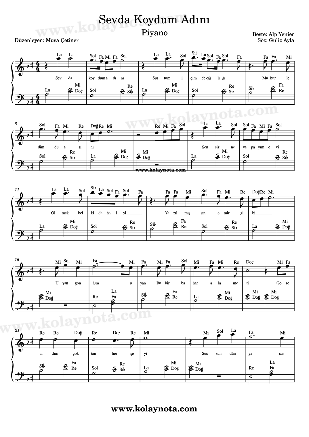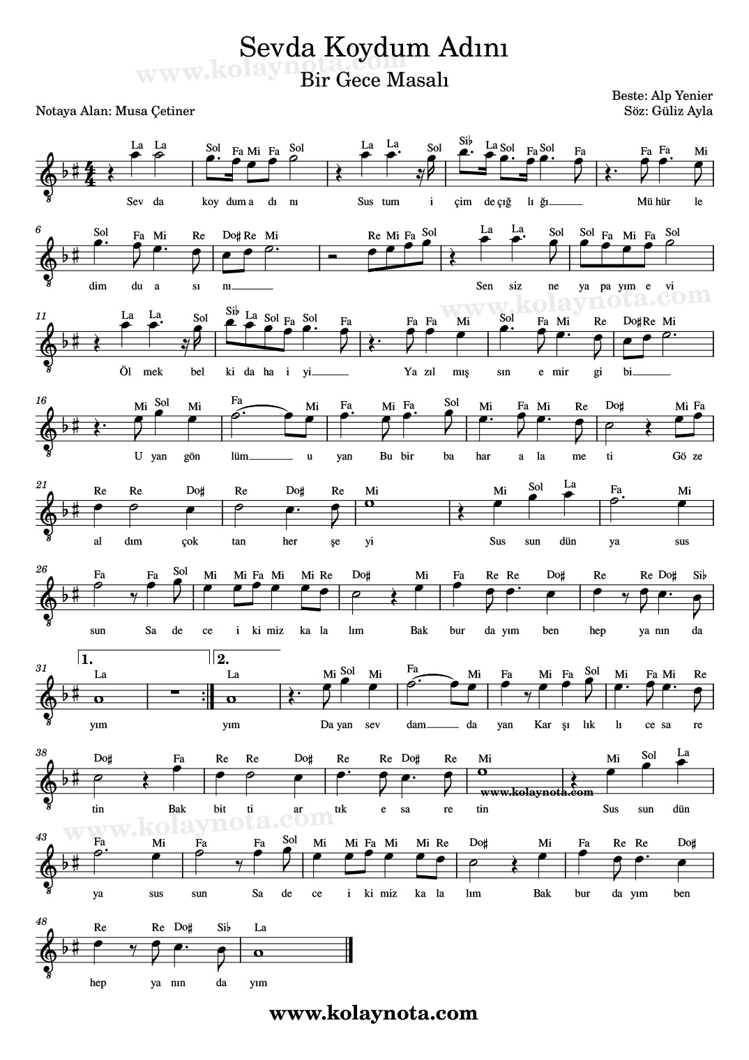 Sevda Koydum Adını, Nota. Bir Gece Masalı dizisinin jenerik şarkısı. Sözleri Güliz Ayla, bestesi Alp Yenier’e ait. Simge tarafından yorumlanmış. Hicaz makamında bestelenmiş, La karar sesinde okunmuş, aynı karar seste notaya aldım. Kolay nota ve piyano düzenlemesini görebilirsiniz. Keman, melodika, flüt, org gibi çalgılarda çalabilir, PDF ve imaj formatlarında görüntüleyebilirsiniz.