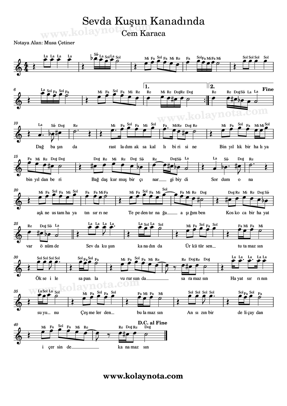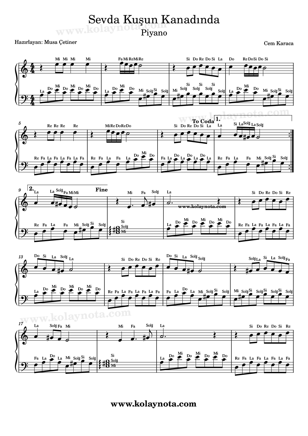 Sevda Kuşun Kanadında, Nota. Cem Karaca’nın çok sevilen bir şarkısı. Sözleri Cem Karaca, bestesi Harout Pamboukjian’a ait. Kolay Nota ve piyano düzenlemesini hazırladım bu yazı için. Hicaz dizisi üzerine bestelenmiş. La Karar sesinde notası, Mi karar sesinde piyano düzenlemesini görebilirsiniz. Keman, melodika, flüt, org gibi çalgılarda çalabilir, PDF ve imaj biçiminde görüntüleyebilirsiniz.