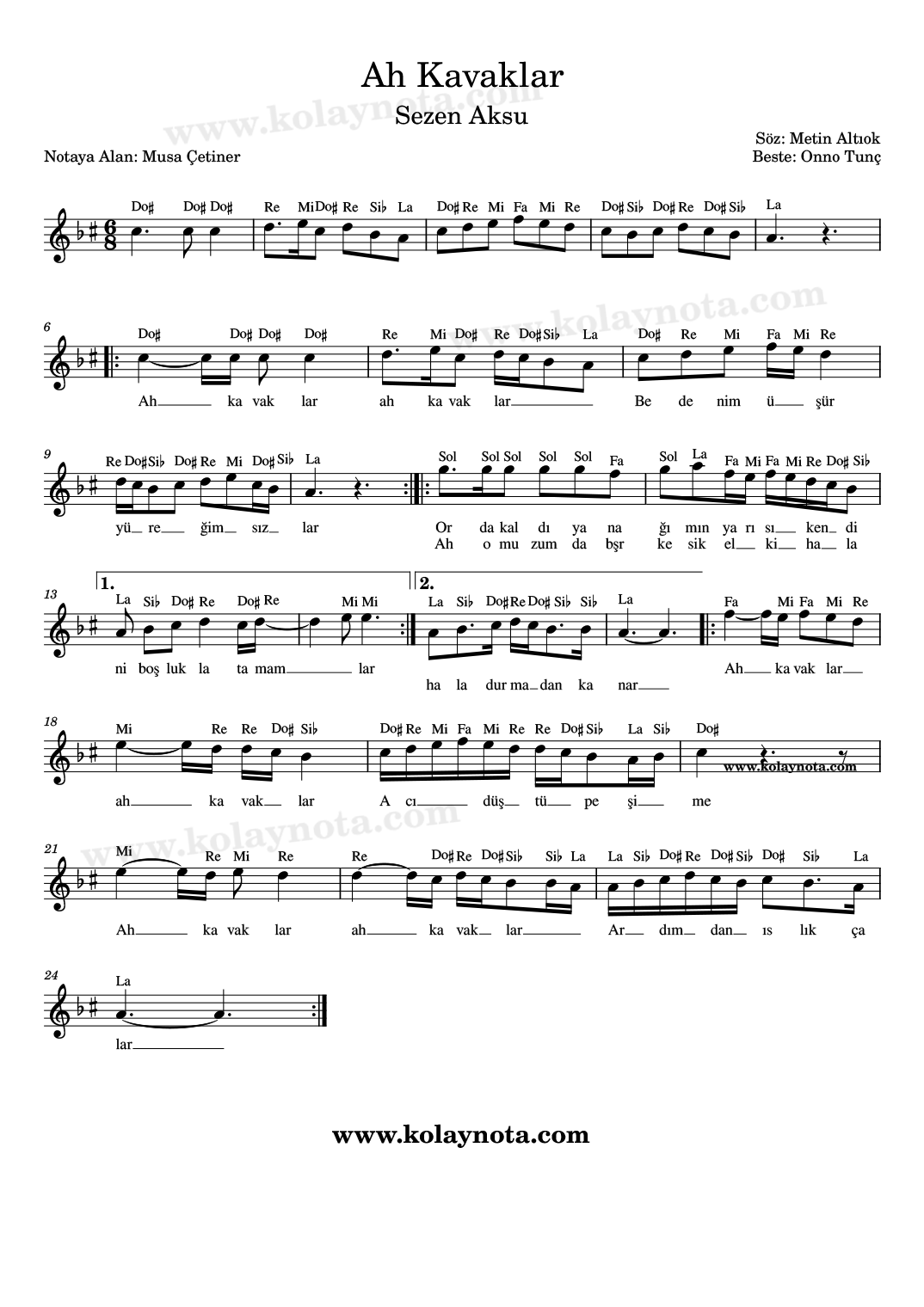 Ah Kavaklar, Nota. Sözleri Metin Altıok, bestesi Onno Tunç’a ait olan bir Sezen Aksu şarkısı. Hicaz makamında bestelenmiş, La karar sesinde notaya aldım. Notasyonu dinleyebilir, keman, piyano, melodika, flüt, org gibi birçok çalgıda çalabilirsiniz. PDF ve imaj formatında görüntüleyebilirsiniz.