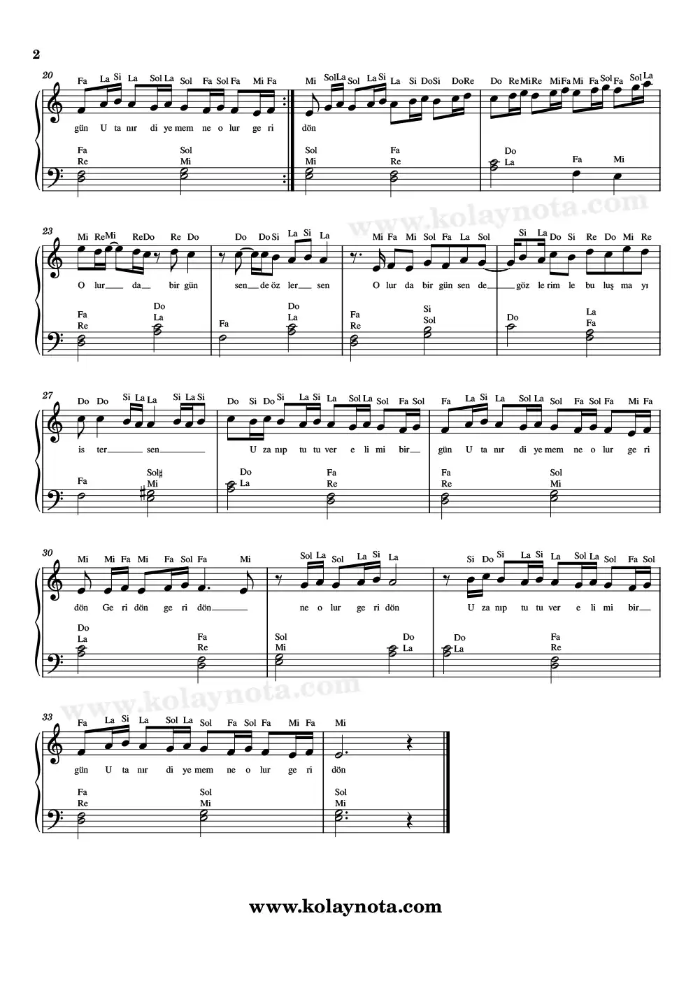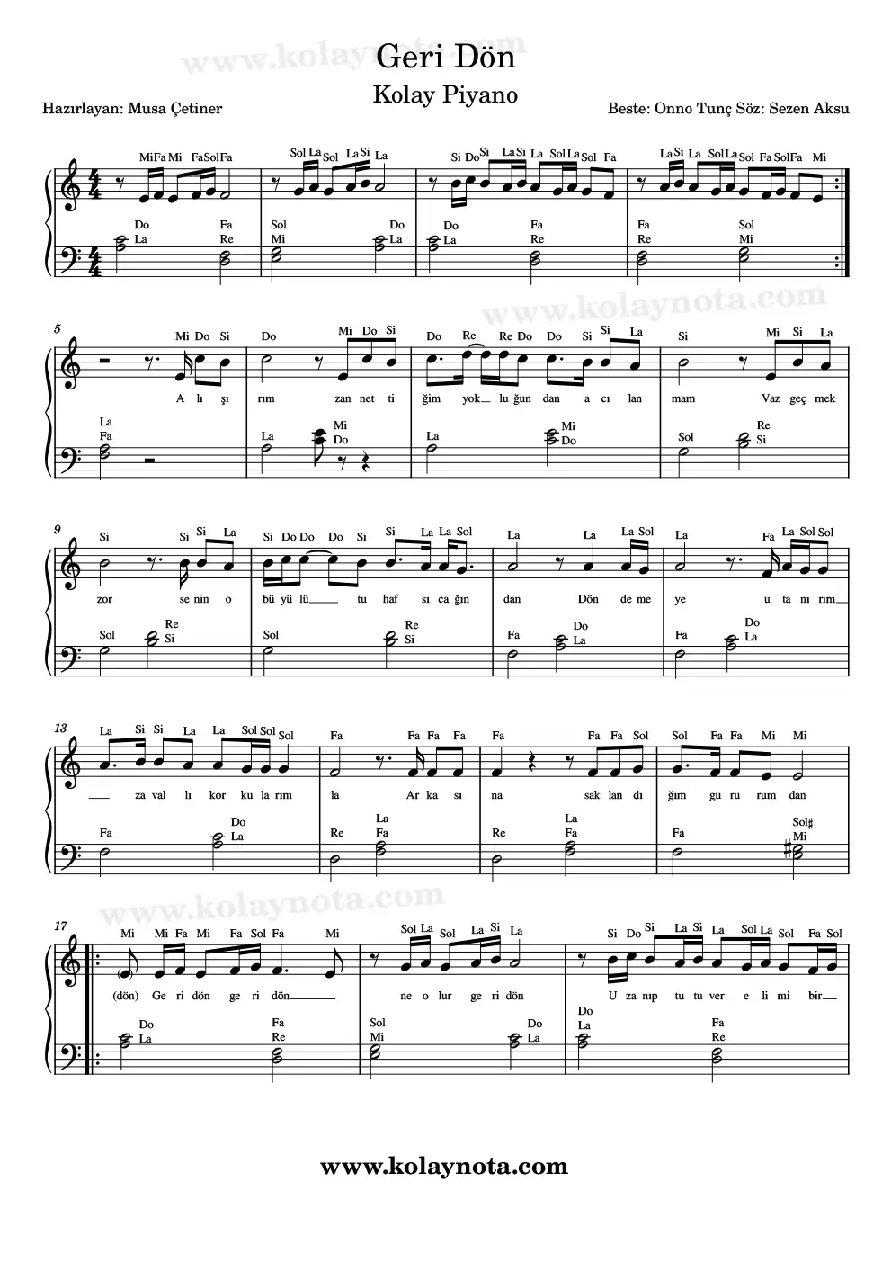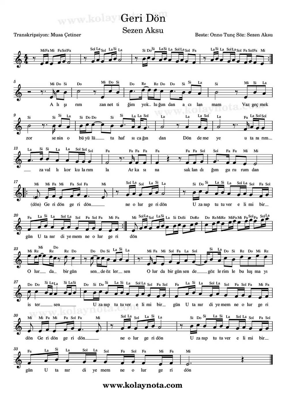 Geri Dön; Sezen Aksu’nun çok sevilen bir şarkısı. Bestesi Onno Tunç, sözleri Sezen Aksu’ya ait. Şarkı sanatçının 1984 yılında çıkan “Sen Ağlama” albümünde yer almış. Mi karar sesinde kolay notası ve piyano notasını görebilirsiniz.