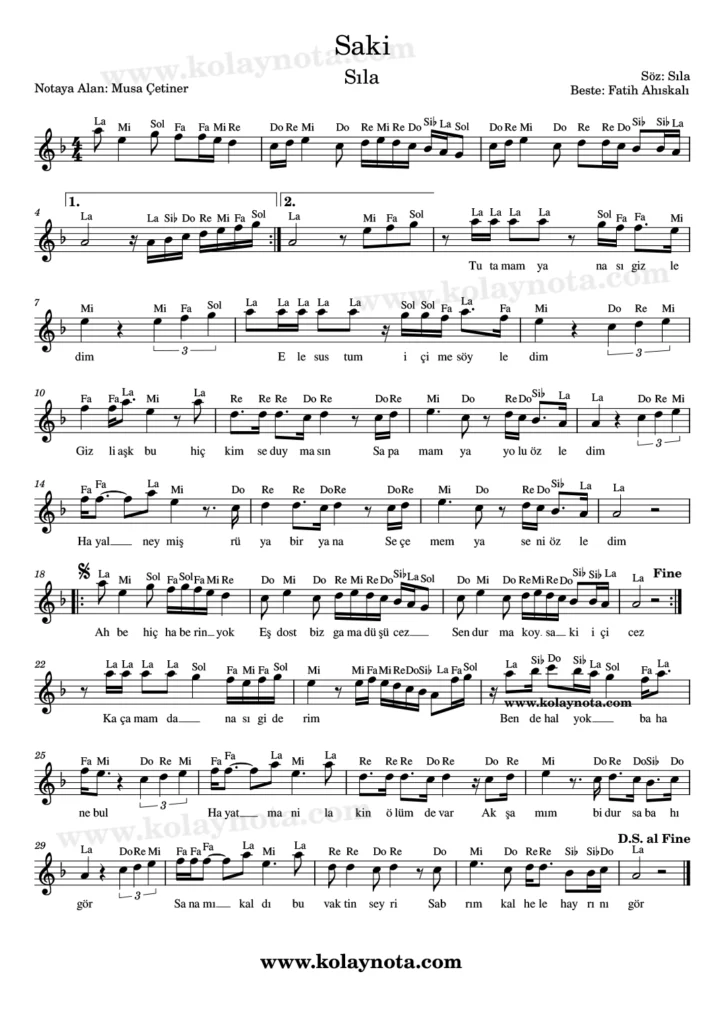 Saki, Nota. Sıla’nın bir şarkısı. Sözleri kendisine bestesi Fatih Ahıskalı’ya ait. Kürdi makamında bir şarkı, La karar sesinde yorumlanmış, aynı karar seste notaya aldım. Kolay notasını görebilirsiniz bu yazıda.