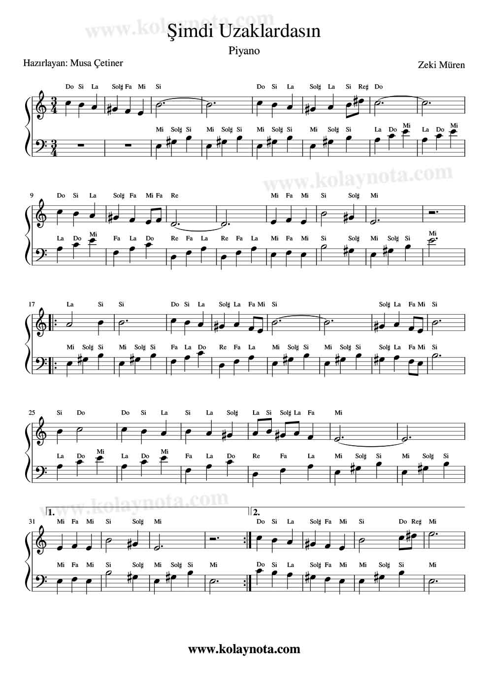 Şimdi Uzaklardasın; Zeki Müren’in seslendirdiği, bestesi de sanatçının kendine ait olan güzel bir eser. Şarkı Suzinak makamında ve 3/4 ölçü birimine sahip. Kolay notasını paylaşacağım, nota çalıcısını da ekliyorum, dinleyip doğru bir biçimde çalabilirsiniz. Başarılar.
