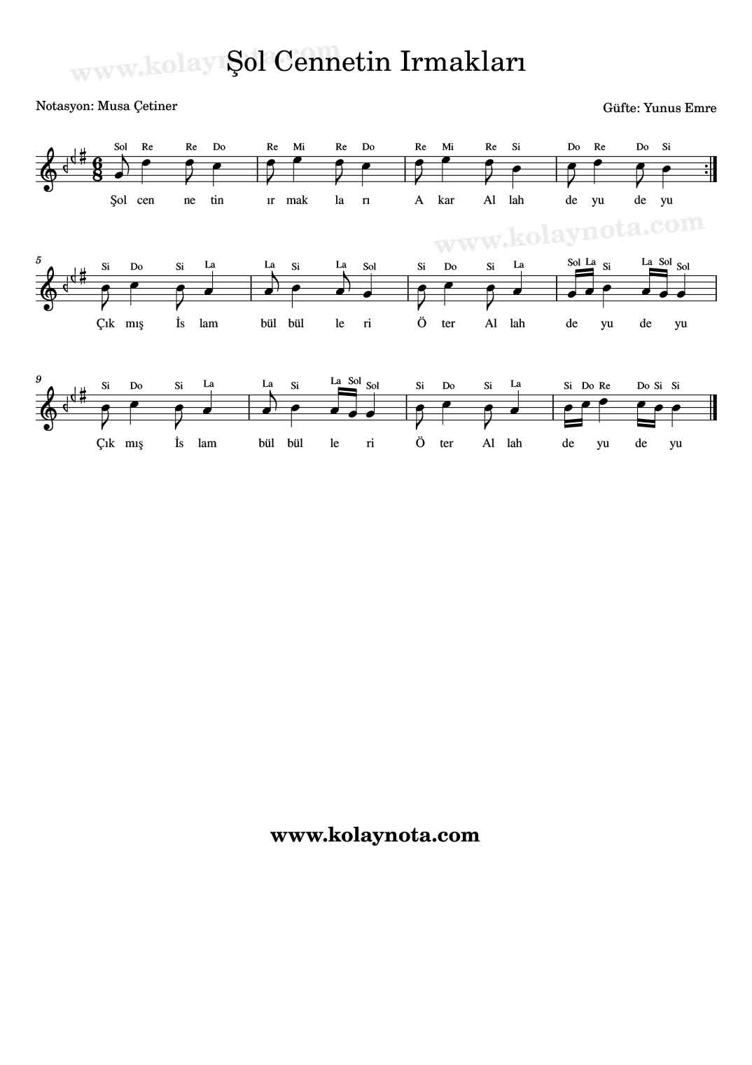 Şol Cennetin Irmakları Nota. Güftesi Yunus Emre’ye ait Segah makamında ve 6/8 ölçü birimine sahip anonim bir ilahi. Bestecisinin Münir Nurettin Selçuk olduğuna dair bazı kaynaklar var fakat kesin değil. Si Karar sesinde Do Re Mi ve Kolay Notasını görebilirsiniz.