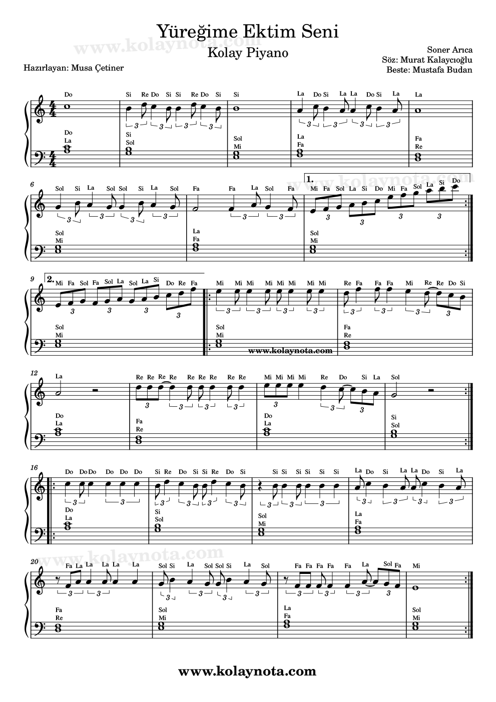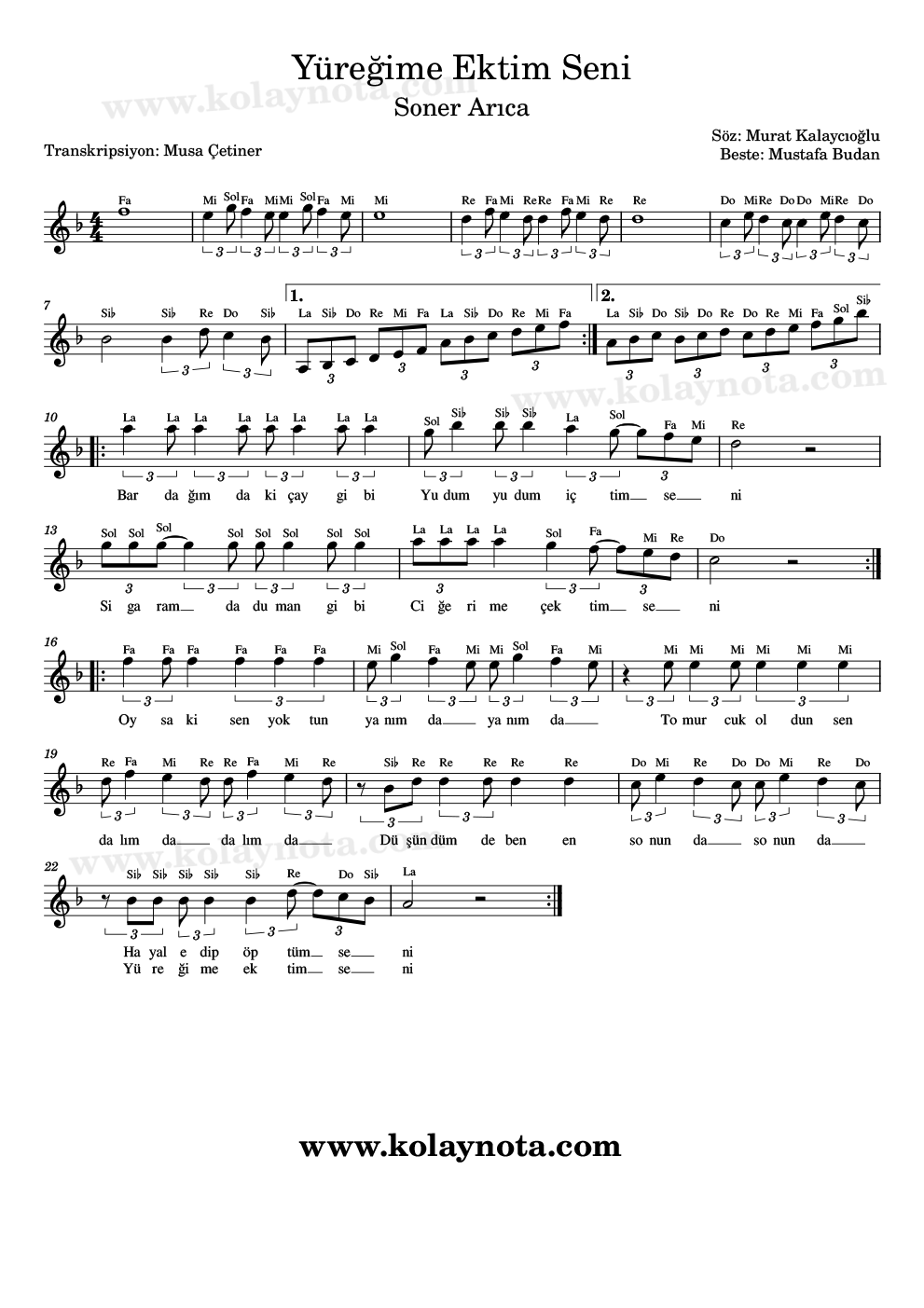Yüreğime Ektim Seni, Nota. Bestesi Mustafa Budan, sözleri Murat Kalaycıoğlu’na ait ve Soner Arıca’nın seslendirdiği bir şarkı. Kürdi dizisi üzerine bestelenmiş ve Re Karar sesinde söylenmiş. Ben La karar sesinde kolay nota ve piyano düzenlemesi, Mi karar sesinde ise do re mi notasyonunu hazırladım. Keman, melodika, flüt, org, bağlama, ud gibi çalgılarda çalabilir, PDF ve imaj formatında görüntüleyebilirsiniz.