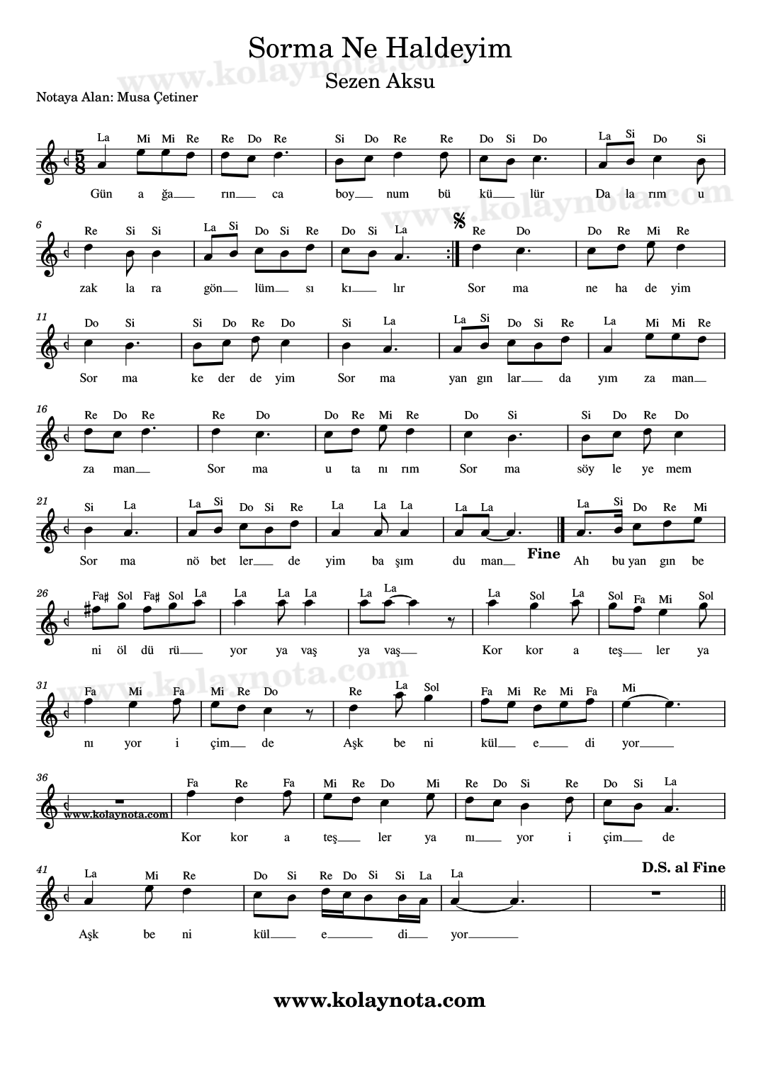 Sorma Ne Haldeyim, Nota. Sözü ve müziği Sezen Aksu’ya ait olan bir şarkı. İlk olarak Ayşegül Aldinç’in 1991 yılında çıkan ” Sorma – Benden Söylemesi” albümünde yer almış. Uşşak makamında bir şarkı, La Karar sesinde notaya aldım.