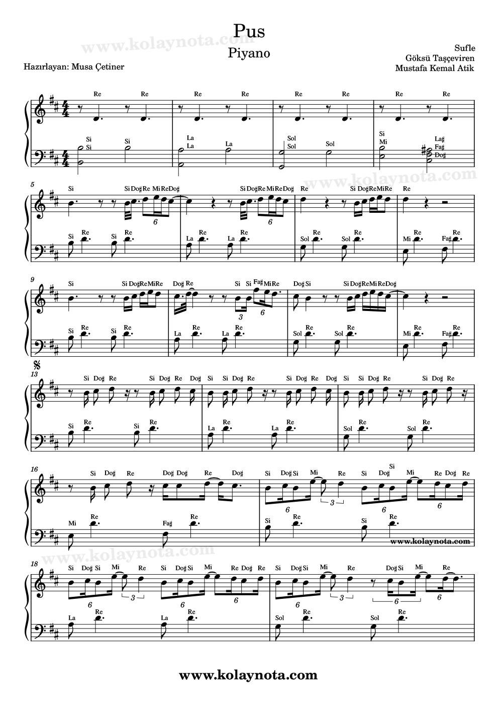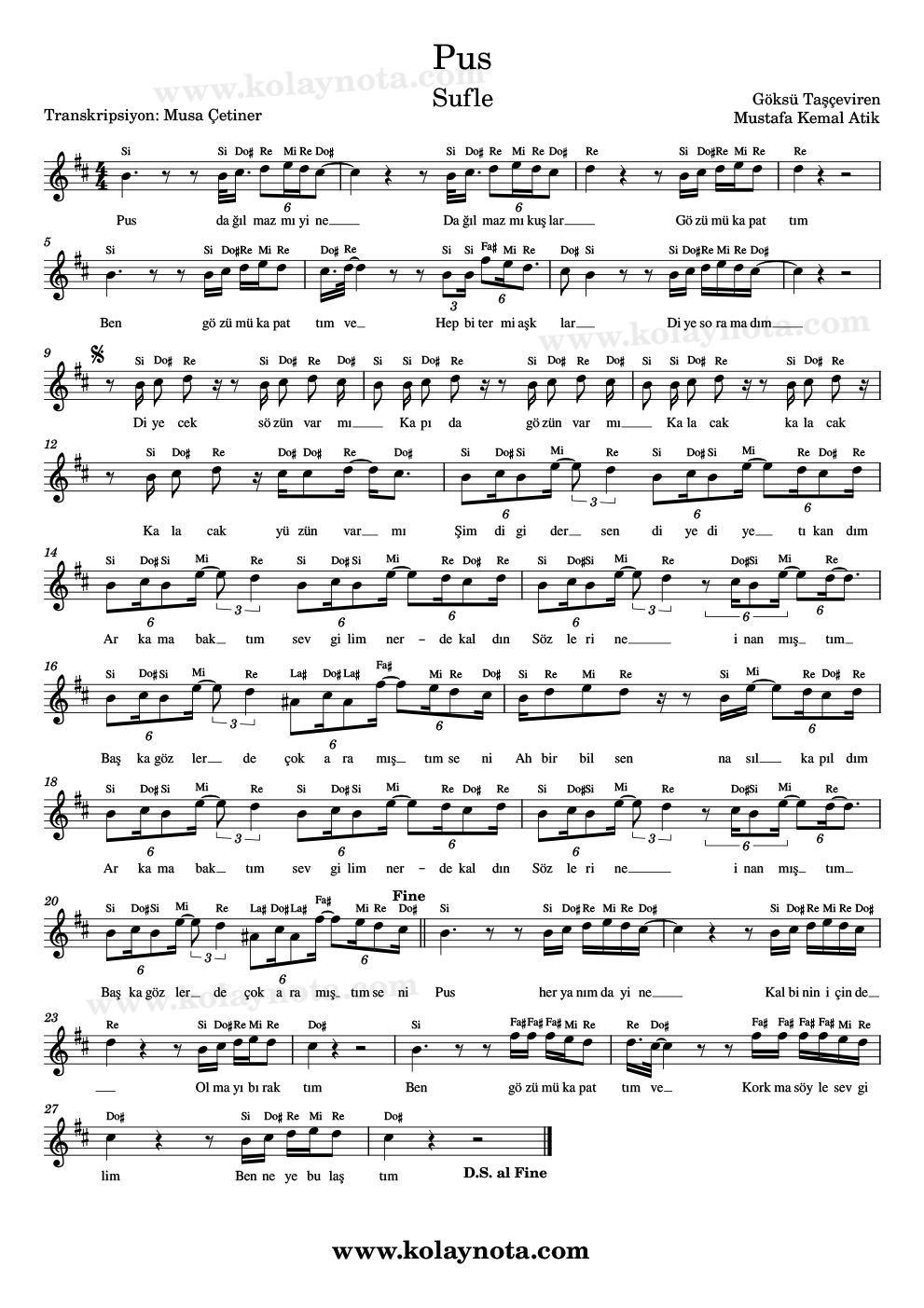 Pus, Nota. Bestesi ve sözleri Gökçe Taşçeviren ve Mustafa Kemal Atik’e ait olan, Sufle grubunun bir şarkısı. Si minör tonunda söylenmiş, aynı tonda kolay nota ve piyano düzenlemesini hazırladım. Keman, melodika, flüt, org gibi çalgılarda çalabilir, PDF ve imaj biçimlerinde görüntüleyebilirsiniz.
