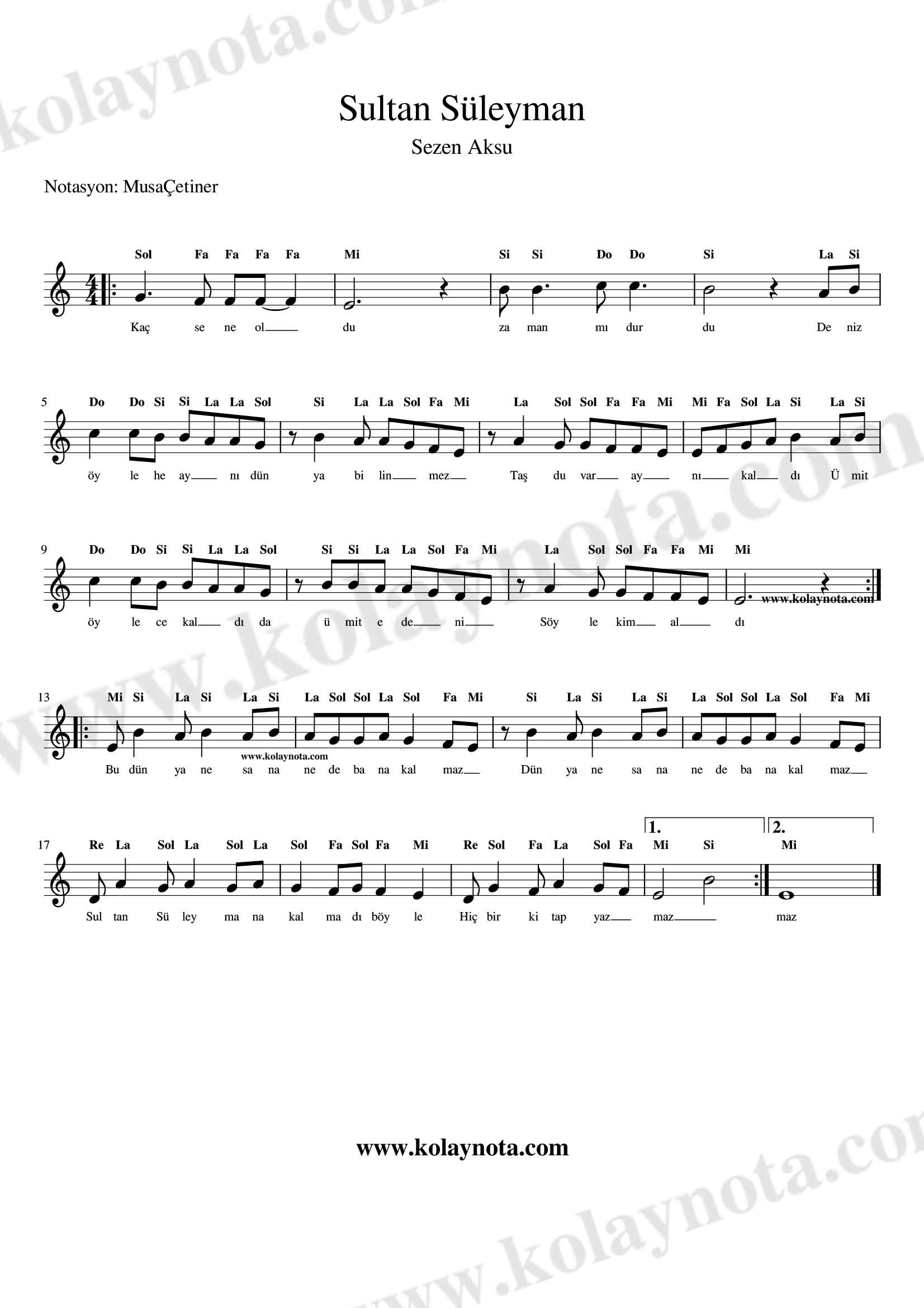 Sultan Süleyman – Kolay Notası