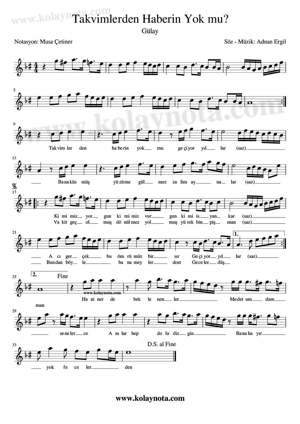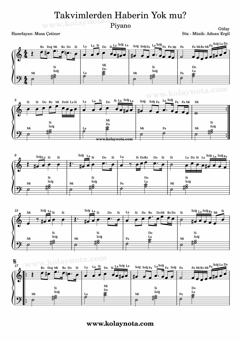 Takvimlerden Haberin Yok mu? – Kolay Nota by Musa Çetiner