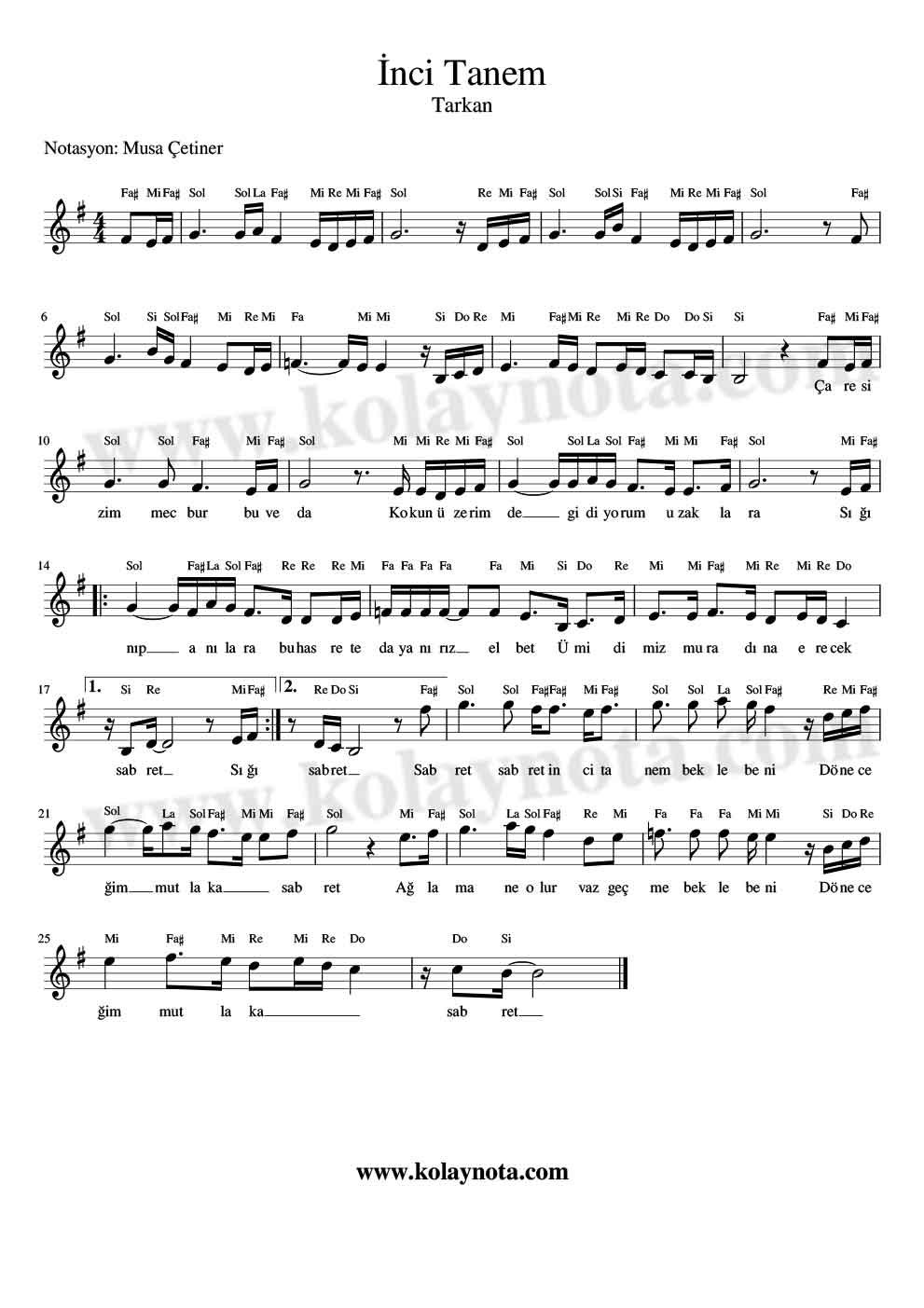 İnci Tanem; Tarkan’ın 1997 yılında çıkan “Ölürüm Sana” albümünde yer alan bir çalışma. Şarkının sözü ve müziği yine Tarkan’a ait. Kolay notasını paylaşacağım bu yazıda. Sanatçı şarkıyı Fa minör tonunda yorumlamış, buradaki notasyon mi minör tonunda. Fa minör tonunda 4 tane bemol var o yüzden çalmanız zor olur diye düşünerek mi minör tonunda notaya aldım şarkıyı. Bu güzel şarkıyı keman, flüt, org, melodika gibi çalgılarda çalabilirsiniz. Soru, görüş, öneri ve isteklerinizi yorumlara yazabilirsiniz. Başarılar