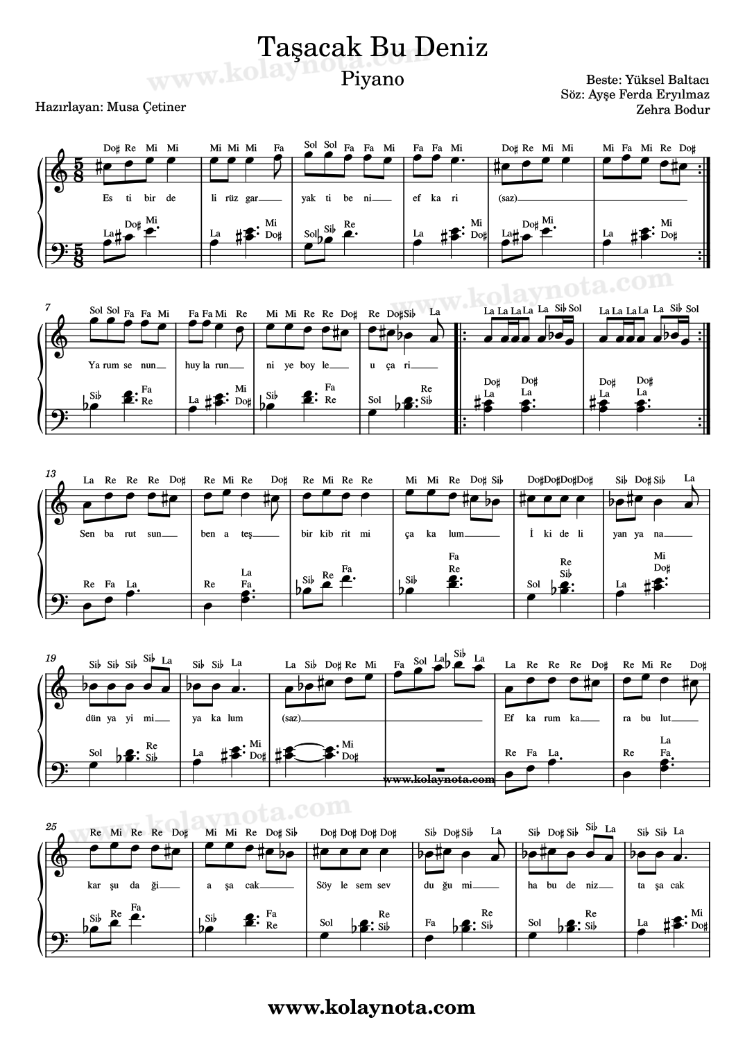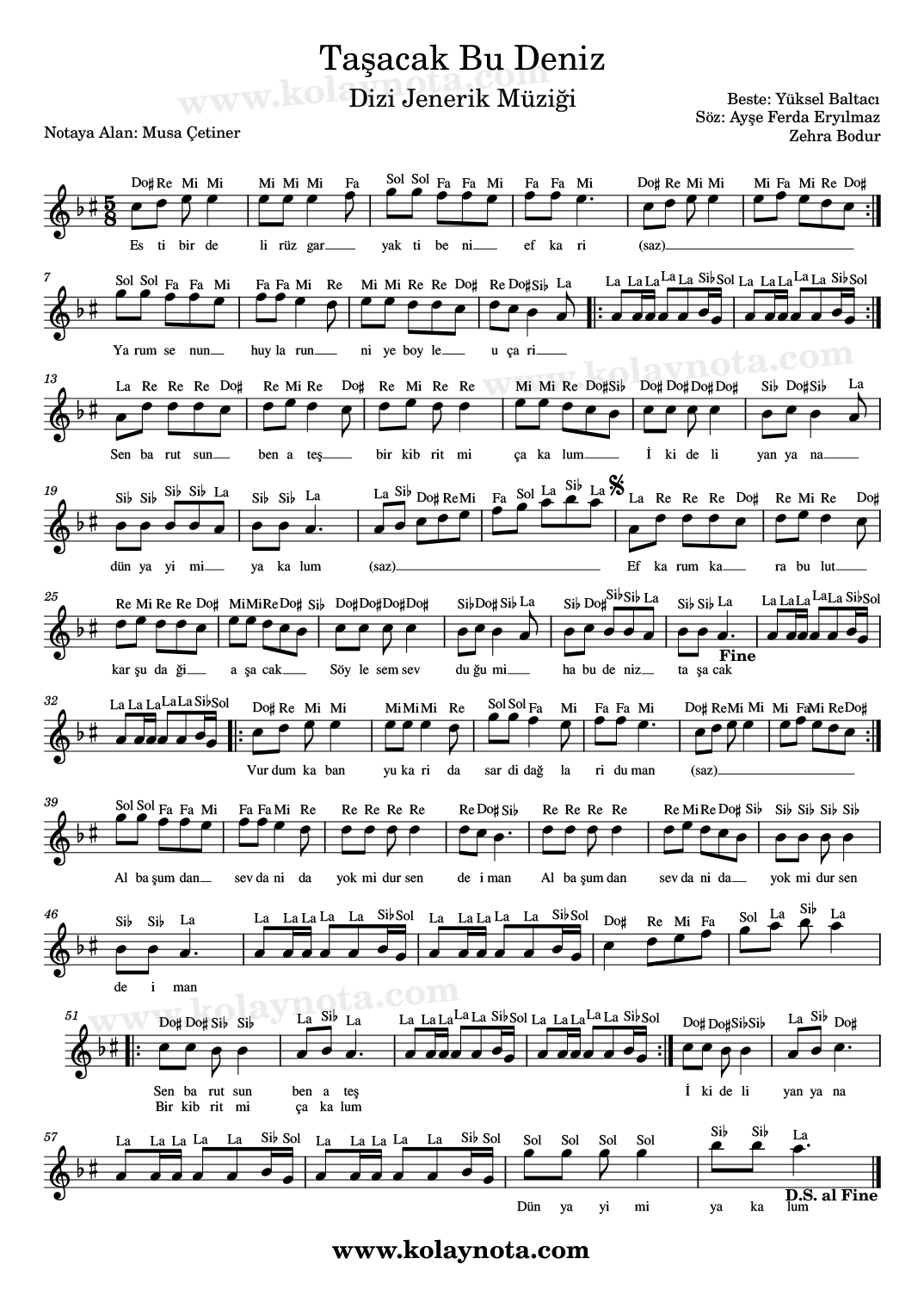 Taşacak Bu Deniz, Jenerik Müziği, Nota. Hicaz makamında bir şarkı. Sözleri Ayşe Ferda Eryılmaz ve Zehra Bodur, bestesi Yüksel Baltacı’ya ait. La karar sesinde Kolay Nota ve Piyano düzenlemesini görebilirsiniz. Keman, melodika, flüt, org, bağlama, ud gibi çalgılarda çalabilir, PDF ve imaj biçiminde görüntüleyebilirsiniz.