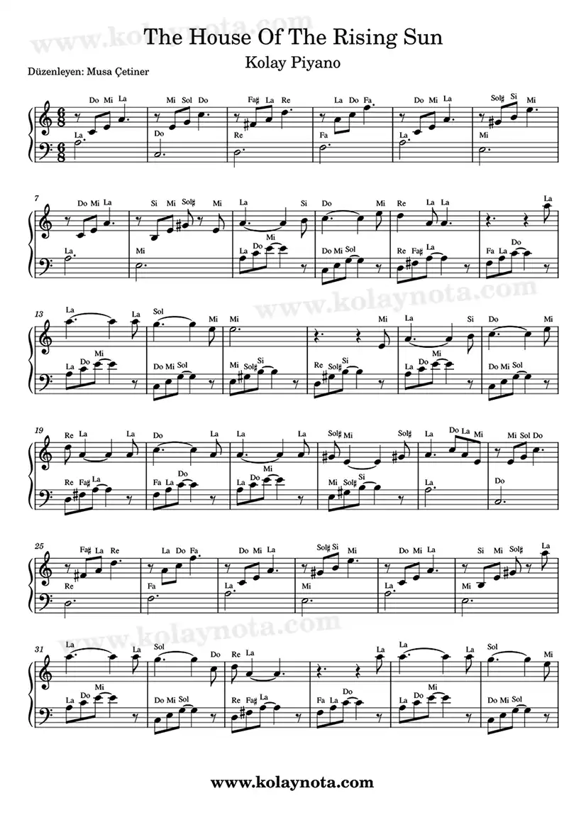 The House Of The Rising Sun Nota, bir halk şarkısı. Çok bilinen bir şarkı aslında. İlk olarak “The Animals” grubundan dinlediğimi hatırlıyorum. Piyano düzenlemesini hazırladım bu yazı için. Her ne kadar piyano için olsa da melodiyi keman, melodika, flüt, org gibi çalgılarda da çalabilirsiniz.