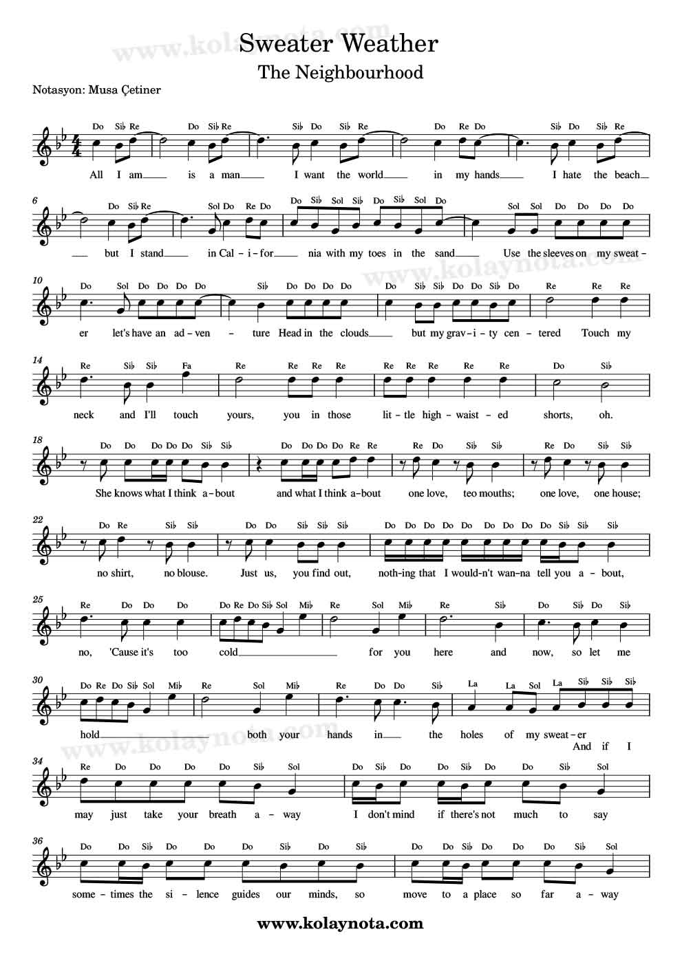 Sweater Weather; The Neighbourhood grubunun bir şarkısı. Kolay Notası ve piyano notasını hazırladım. Kolay notası şarkının orjinal tonu olan Sol Minör tonunda.