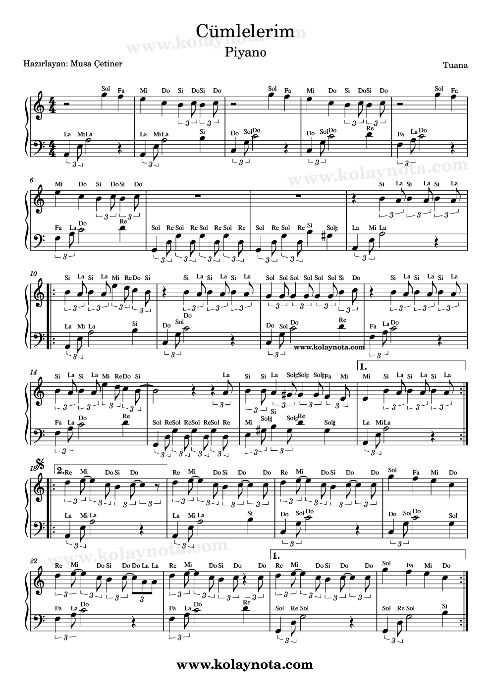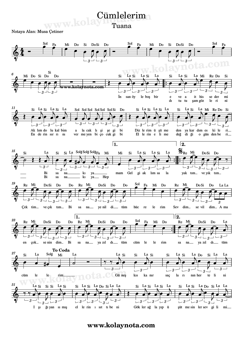 Cümlelerim, Nota. Tuana’nın bir şarkısı, sözü ve müziği kendisine ait. Si minör tonunda yorumlanmış, ben La Minör tonunda Kolay Nota ve piyano düzenlemesini hazırladım. Keman, melodika, flüt, org gibi çalgılarda çalabilir, PDF ve imaj biçiminde görüntüleyebilirsiniz.