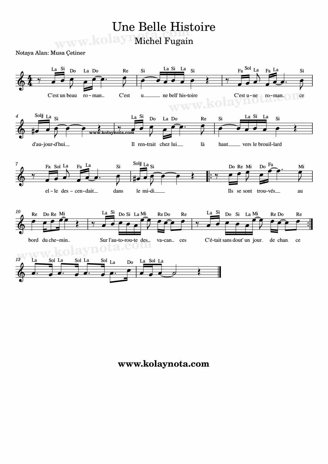 Une Belle Histoire, Nota. Michel Fugain’in bir şarkısı. Eser 1972 yılında çıkan “Fugain et le Big Bazar” adlı albümde yer almış. La minör tonunda notaya aldım. Keman, melodika, flüt, org, piyano gibi çalgılarda çalabilir, PDF ve jpg biçiminde görüntüleyebilirsiniz. Notayı dinleyerek doğru bir şekilde çalışabilirsiniz.