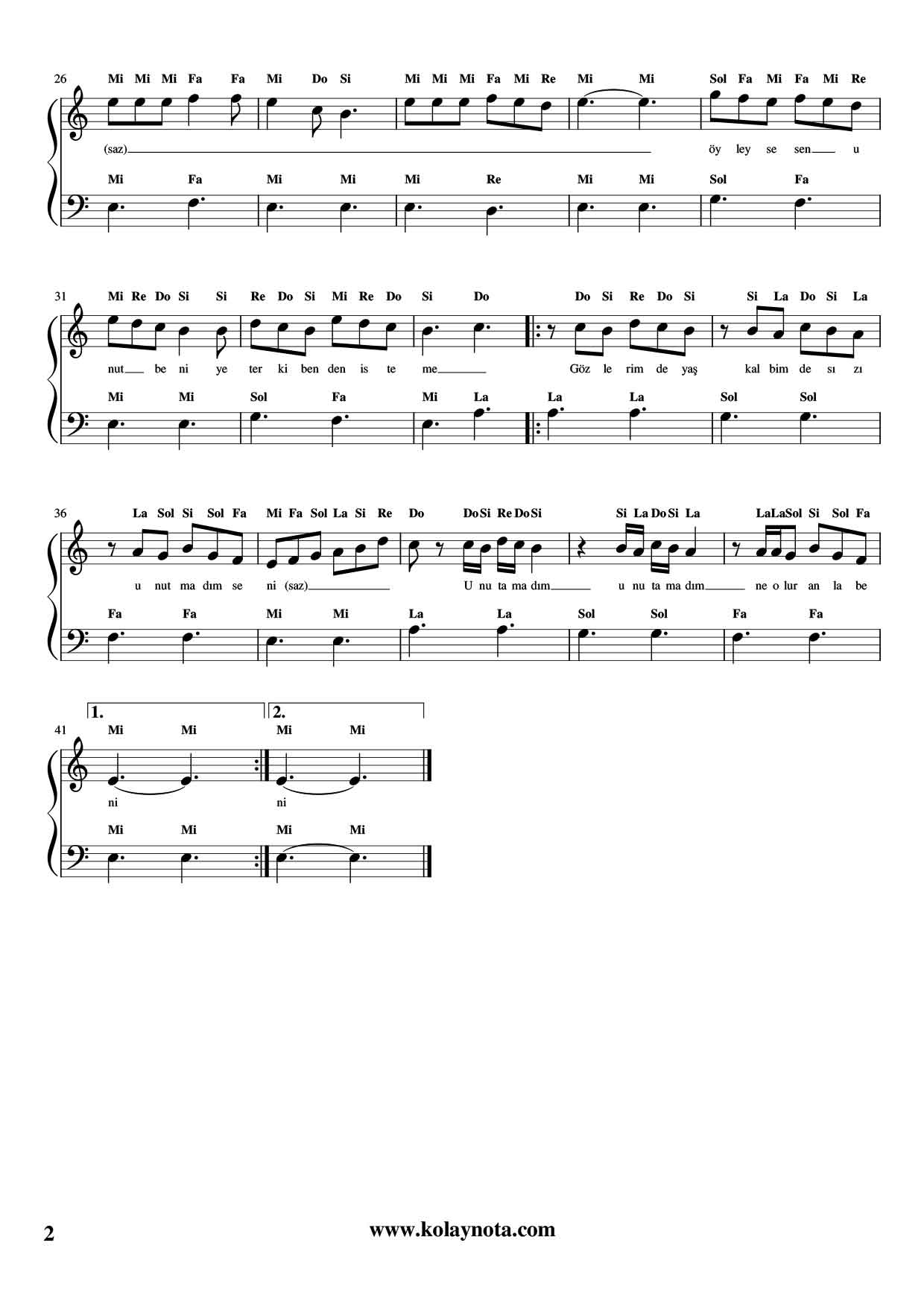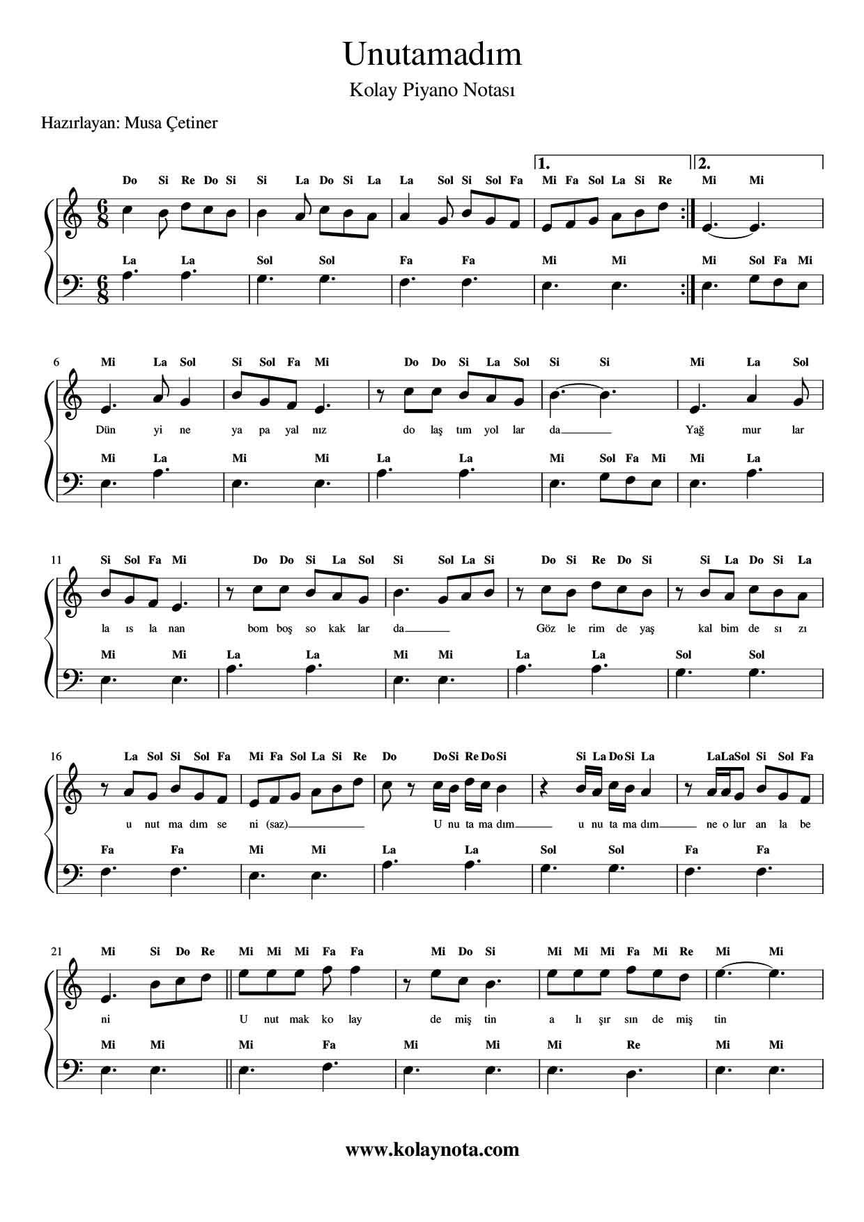 Unutamadım – Kolay Piyano Notası