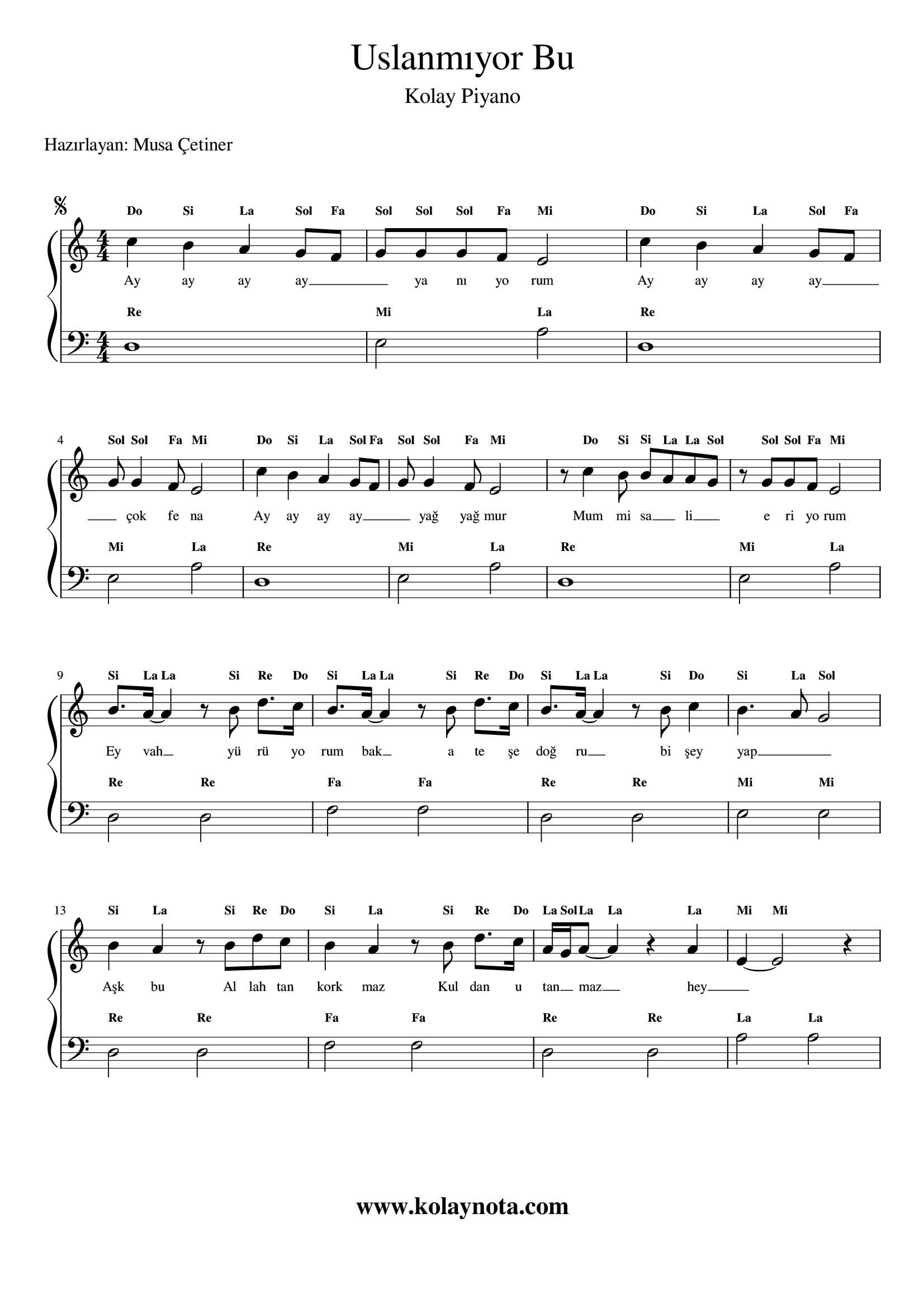 Uslanmıyor Bu; söz ve müziği Sezen Aksu’ya ait olan bir Zeynep Bastık şarkısı. Kolay piyano şeklinde hazırladım. Pdf ve jpg biçiminde görebilirsiniz. Youtube videosunu da ekliyorum, çalınış hakkında fikir sahibi olabilirsiniz.