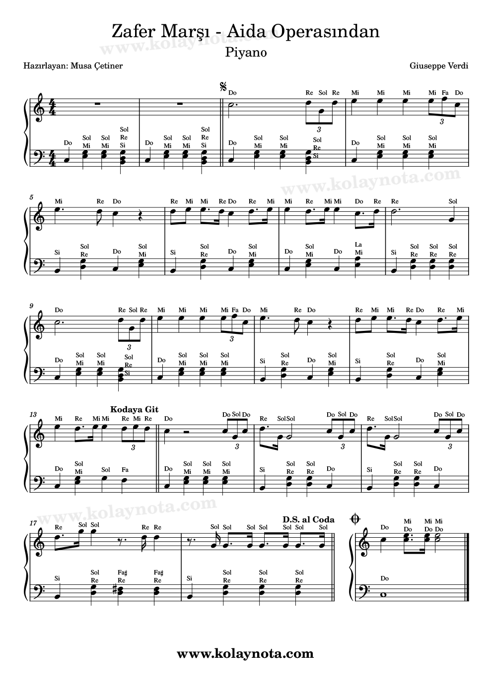 Zafer Marşı, Nota. Giuseppe Verdi’nin Aida operasından çok bilinen bir şarkı. Do majör tonunda notaya aldım. Kolay nota ve piyano düzenlemesini görebilirsiniz yazının içeriğinde. Keman, melodika, piyano, flüt, org gibi çalgılarda çalabilir, PDF ve imaj biçimlerinde görüntüleyebilirsiniz.