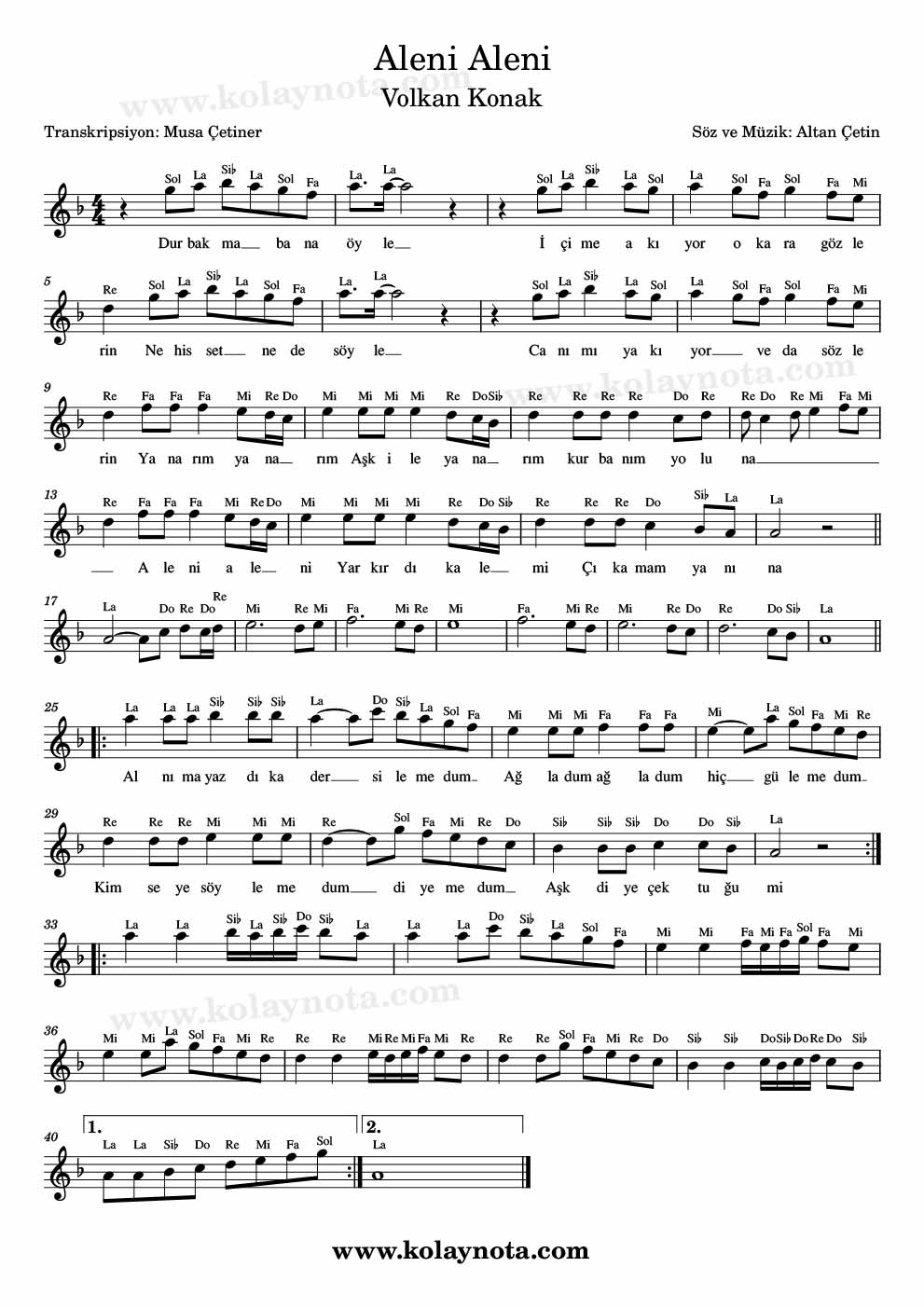 Bu yazının konusu Volkan Konak’ın Aleni Aleni şarkısının notasıydı. Sanatçının notaya aldığım diğer şarkılarına da sitede ulaşabilir, repertuarınızı genişletebilirsiniz. Sitedeki notasyonları keman, piyano, bağlama, melodika, flüt, org gibi çalgılarda çalabilirsiniz. Soru ve isteklerinizi yorumlara yazmayı unutmayın. Teşekkürler.