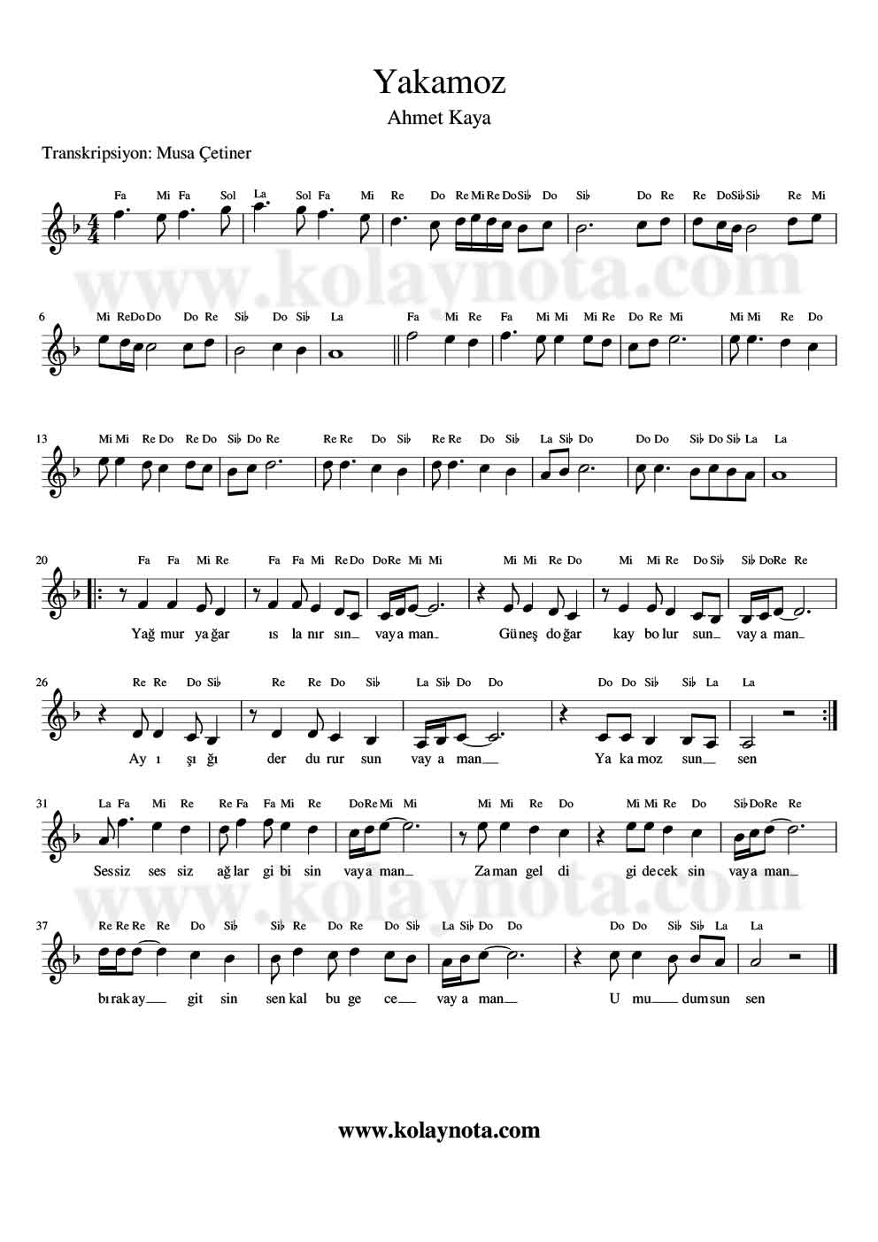 Keman, melodika, flüt, org notası. Yakamoz, sözü ve müziği Ahmet Kaya’ya ait olan bir şarkı. Do Re Mi ve Kolay Notalarını paylaşacağım bu yazıda. Kürdi makamında bir şarkı, notasyonları La karar sesinde hazırladım. Do Re Mi notasyonu sadece sözlü bölümleri içeriyor, kolay notasında şarkının giriş bölümü de mevcut.