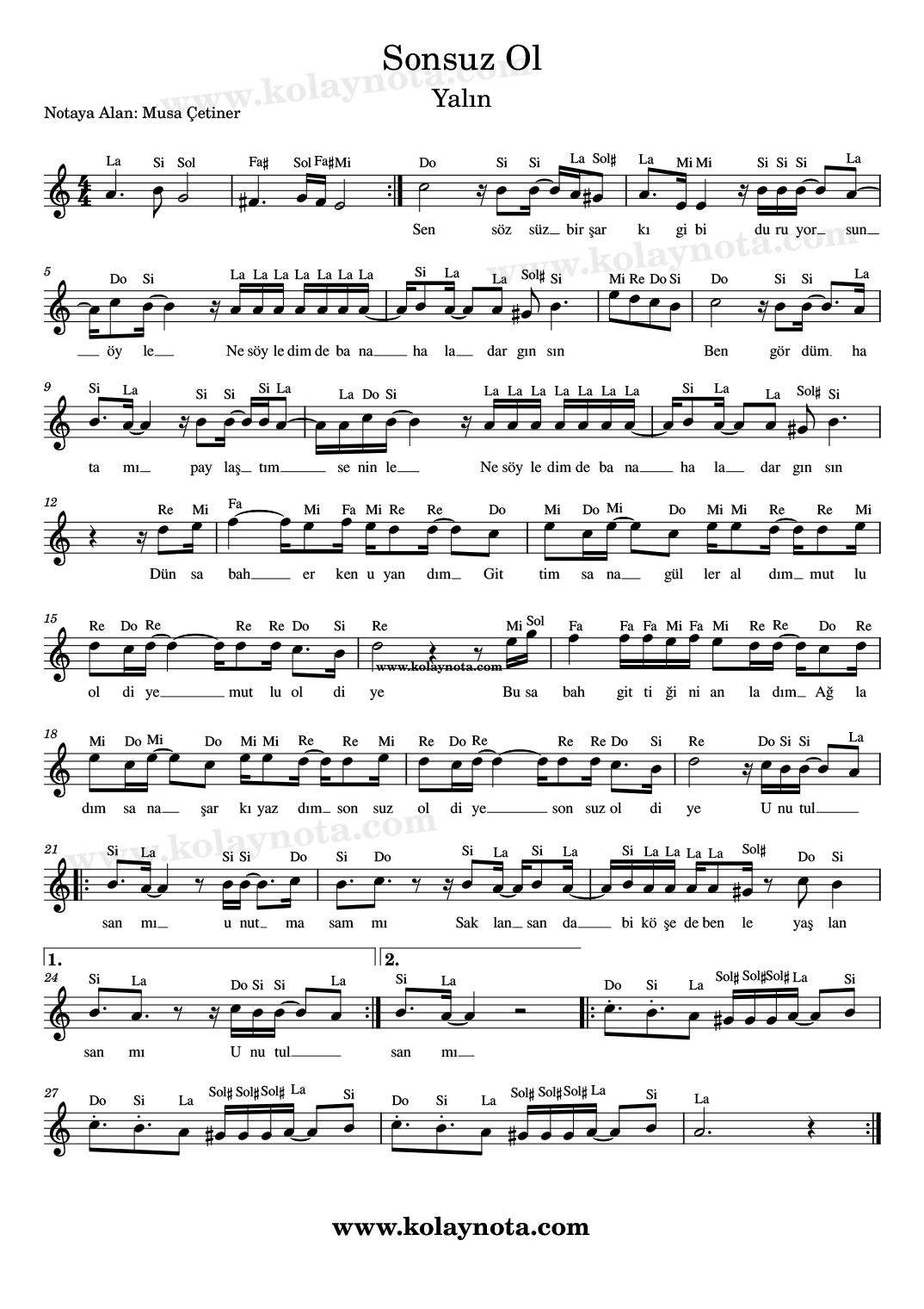 Sonsuz Ol, Nota. Yalın seslendirdiği bir şarkı. Sözü ve müziği kendisine ait. 2004 yılında çıkan ilk albümünde yer almış. Si bemol karar sesinde yorumlanmış, ben La karar sesinde notaya aldım. Keman, piyano, melodika, flüt, org gibi çalgılarda çalabilir, PDF ve imaj biçiminde görüntüleyebilirsiniz.