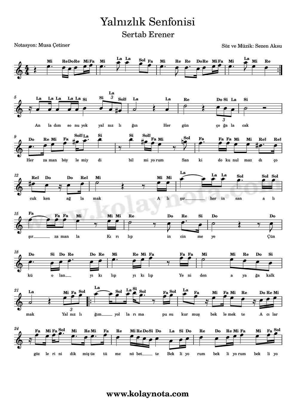 Yalnızlık Senfonisi ilk olarak Sertab Erener‘in yorumladığı, sözü ve müziği Sezen Aksu‘ya ait olan bir şarkı. Kolay notasını paylaşacağım bu yazıda. Sertab Erener şarkıyı La minör tonunda yorumlamış, ben de aynı tonda notaya aldım.