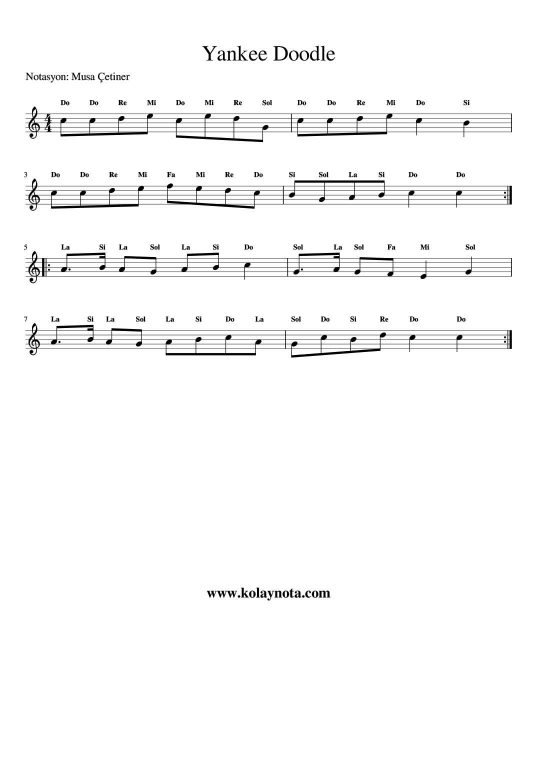 Yankee Doodle bir Amerikan şarkısı. Do Majör tonunda Do Re Mi ve Kolay Notasyonunu görebilirsiniz. Melodika, keman, flüt, org gibi çalgılarda çalabilirsiniz.