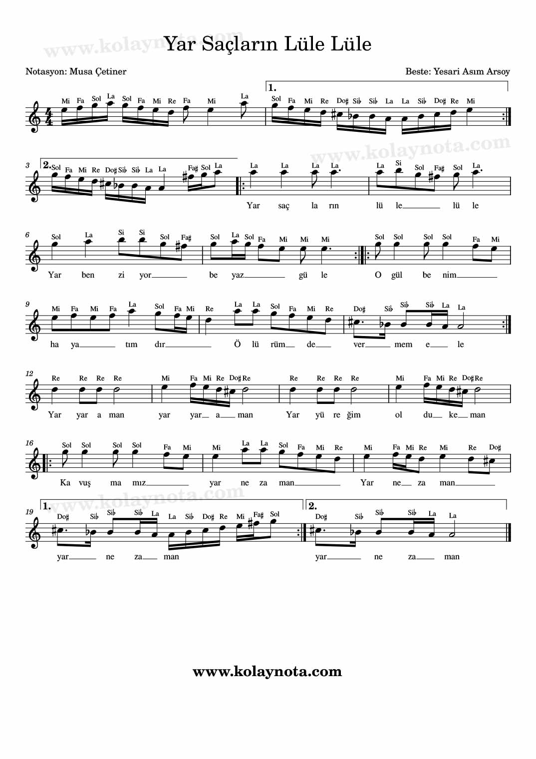 Yar Saçların Lüle Lüle – Nota