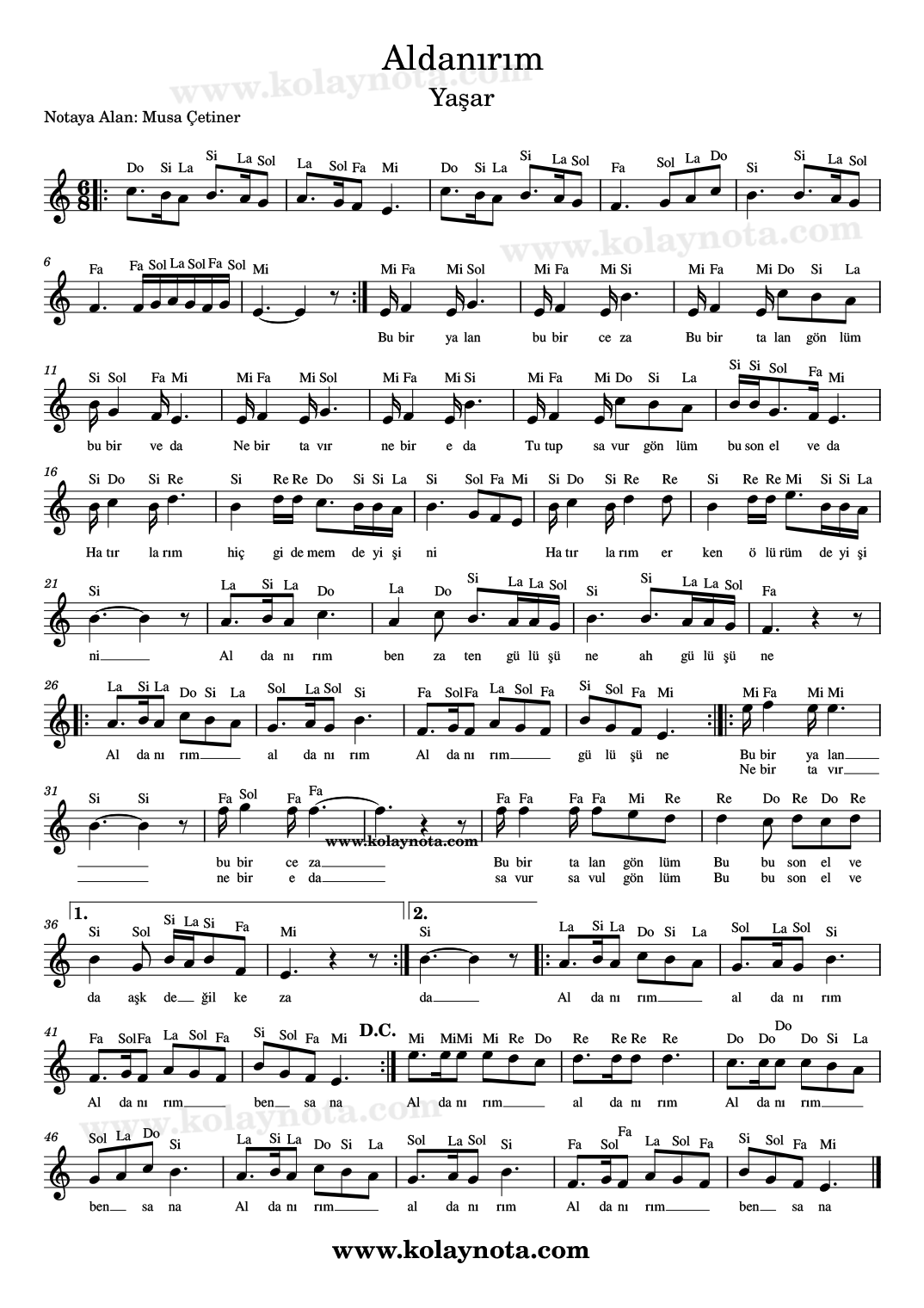 Aldanırım, Nota. Yaşar’ın bir şarkısı, sözü ve müziği kendisine ait. Şarkı sanatçının 2001 yılında çıkan “Masal” adlı albümünde yer almış. Kürdi dizisi üzerine bestelenen bir şarkı. Mi karar sesinde notaya aldım. Kolay nota ve piyano düzenlemesini görebilirsiniz. Keman, melodika, flüt, org gibi çalgılarda çalabilir, PDF ve imaj biçiminde görebilirsiniz.
